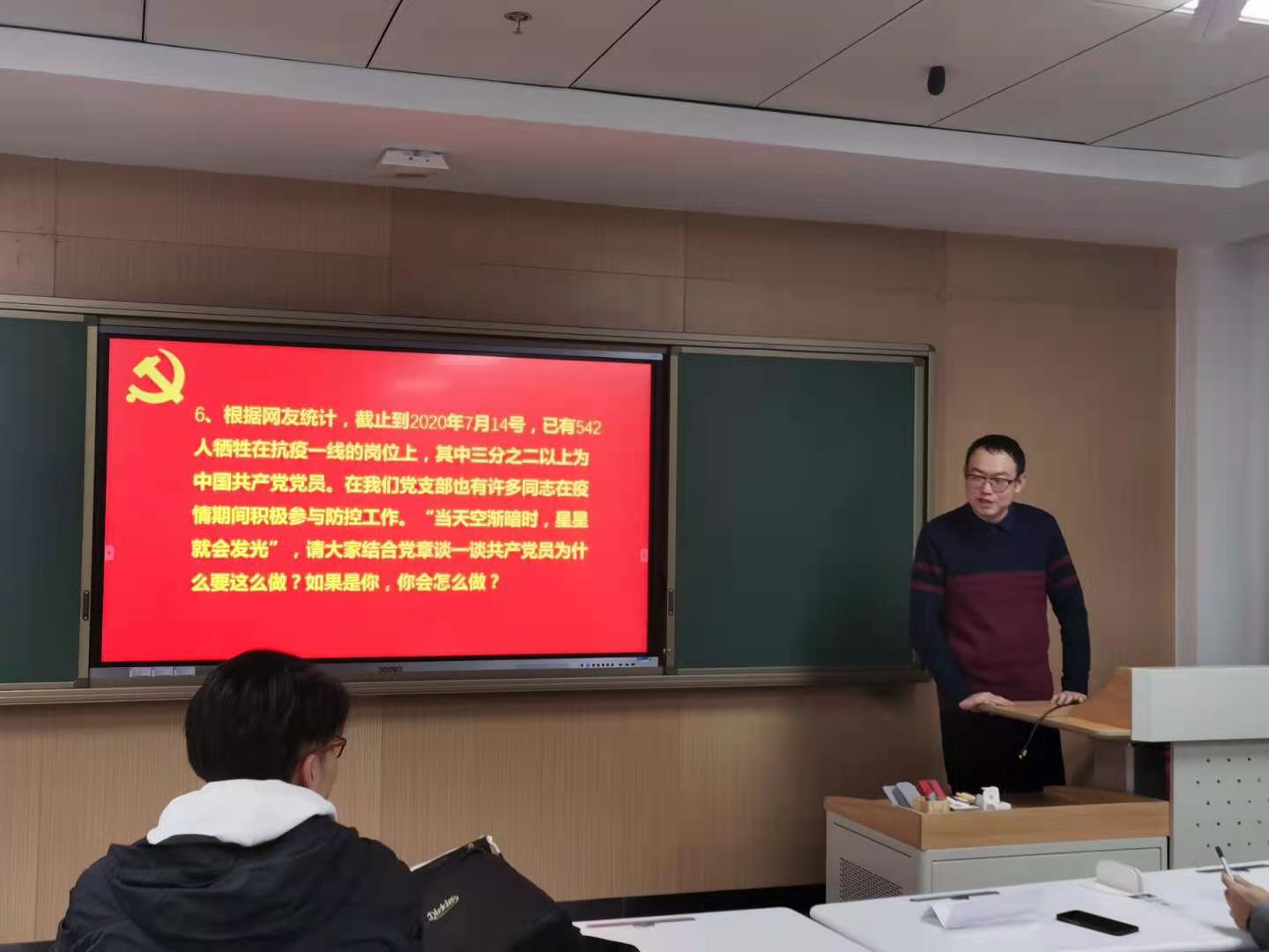 会议第四部分,各位与会人员进行了充分的交流讨论。李鹏作为一名积极分子,针对在抗疫战疫过程中,中国共产党与西方政党的不同发表了自己的看法,他认为,中国共产党是一个为人民服务的政党,一切都以人民为出发点,面对疫情,能够领导全国各族人民科学地抗疫;而西方政党在面对疫情时缺乏合理的管理制度,局势混乱,疫情防控措施不到位。郭磊作为一名积极入党的研究生,就自身出发介绍了他为疫情防控作出的努力,从武汉回家他就要求自己及家人做好自我隔离,不串门,不闲逛,为疫情防控作出自己力所能及的努力。许涛为我们列举了优秀的共产党员事迹,不管是哪些岗位都不乏任劳任怨、无私奉献的优秀共产党,他们为我们树立了良好的榜样,我们自身更要做到不忘初心、牢记使命,敢于担当,勇于作为。姜宇奇作为一名预备党员,针对党章修订的内容,列举了印象深刻的几点,第一点,他表达了自己对“绿水青山就是金山银山”这句话的理解,他认为生态文明建设是社会可持续发展的必要条件;第二点,党是领导一切的,社会中大大小小事件不断证明了党的优越性;第三点,坚持“从严治党”,领导干部要带头抓作风建设,维护党的形象,创造一个廉洁进取的社会。