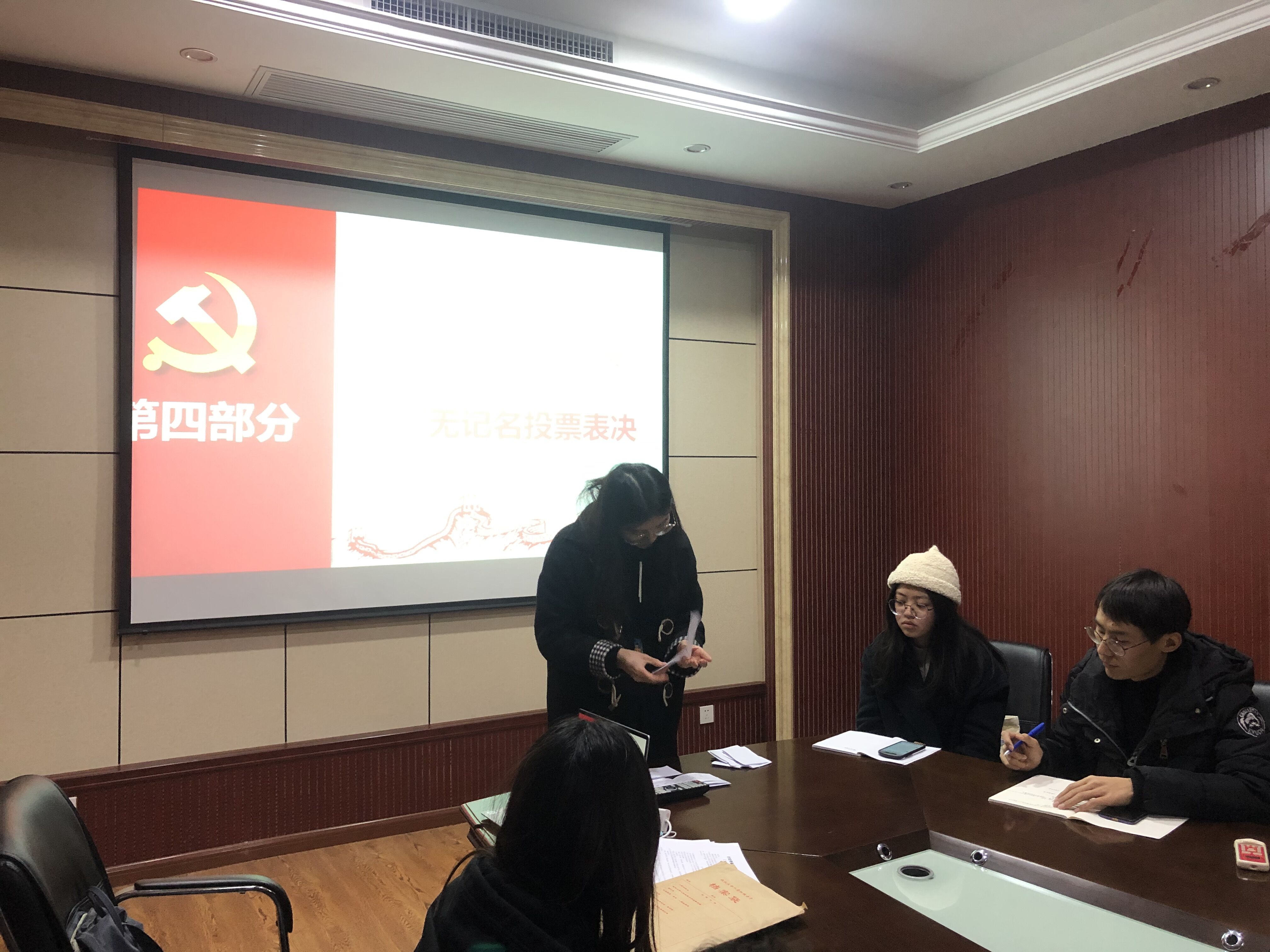 经支部大会讨论,宣传委员赵冲同志和纪律委员冯梅同志分别担任计票人和监票人,支部到场有表决权的9名正式党员进行无记名投票,一致通过了关于辛成同志和顾滢同志的转正申请。支部书记包雨睿同志现场宣读表决结果,同意辛成同志和顾滢同志按期转为正式党员。最后,两位同志进行了表态,向大会表达了自身的想法与决心。支部书记包雨睿同志代表支委会发表意见:希望两位同志成为正式党员后,不要放松对自己的要求,进一步加强理论学习,努力工作,充分发挥党员的先锋模范作用。