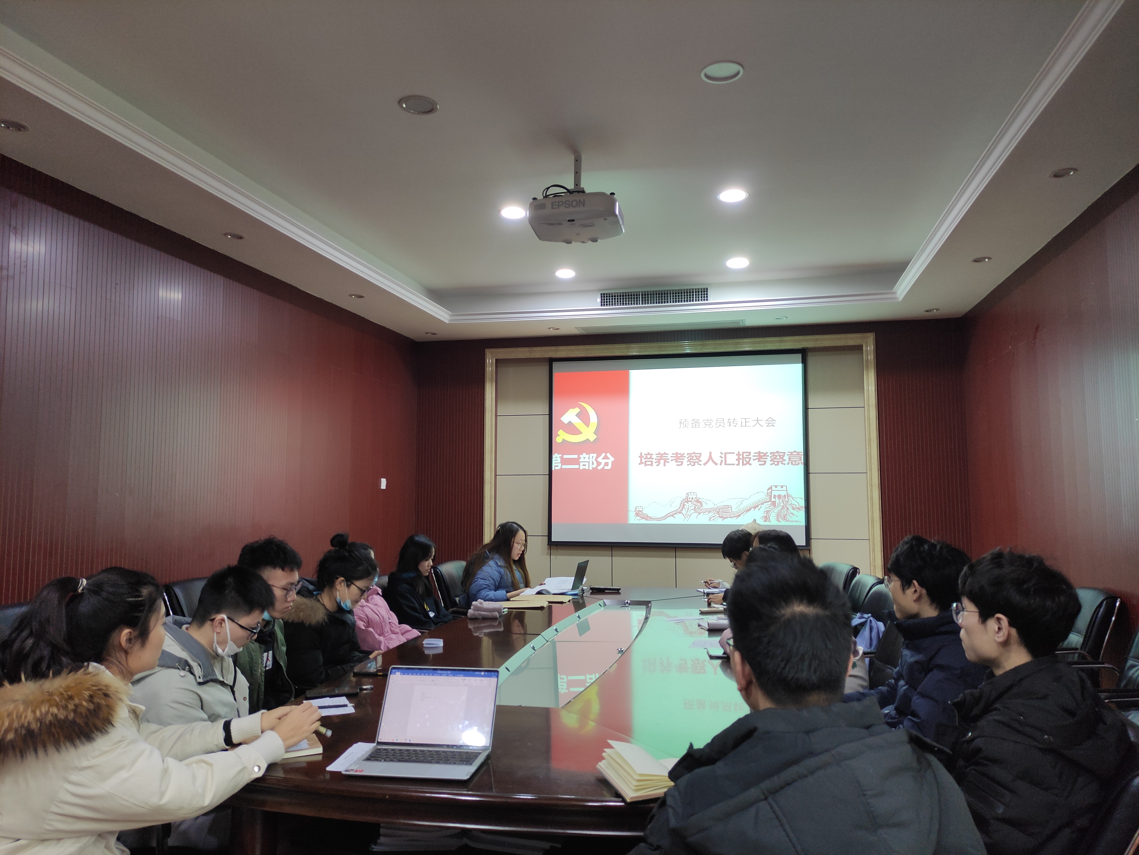 2020年12月18日周五下午四点,地理信息与地图科学系2020级硕士研究生党支部预备党员转正大会暨学习党章主题党日活动于院办504召开,会议讨论并通过了辛成同志和顾滢同志按期转为正式党员的申请。本次会议由支部书记包雨睿同志主持,本次会议应到正式党员12人,预备党员2人;实到正式党员9人,预备党员2人,请假3人。此外,入党积极分子和发展对象也参与了此次会议。