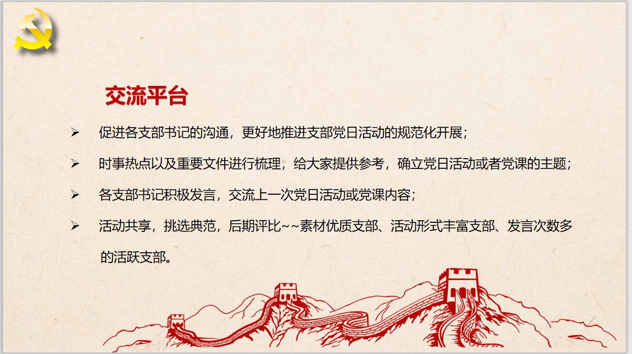 首先,介绍例会的主要目的,就是提供一个交流平台,促进各支部书记的沟通,更好地推进支部党日活动的规范化开展,每次例会会对近期的一些时事热点以及发布的文件进行梳理,给各支部提供参考,党支书们可以结合这些内容确立党日活动或者党课的主题。各支部书记共享支部建设情况及内容,后期会评选出素材优质的支部、活动形式丰富的支部、参与度活跃度发言次数多的支部。