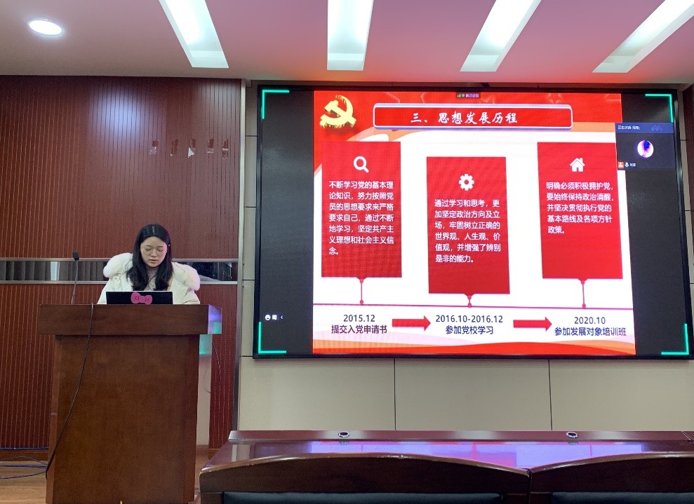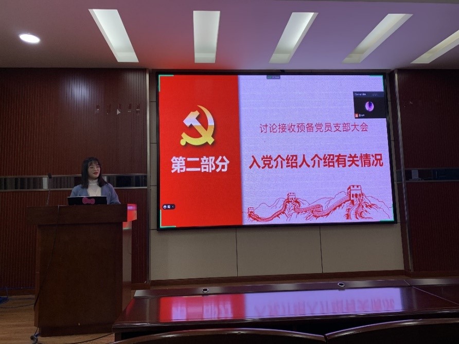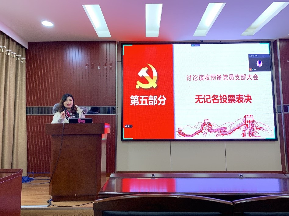 220会议室召开预备党员接收支部大会,组织委员刘馨同志主持会议,辅导员梅菲老师列席参加。