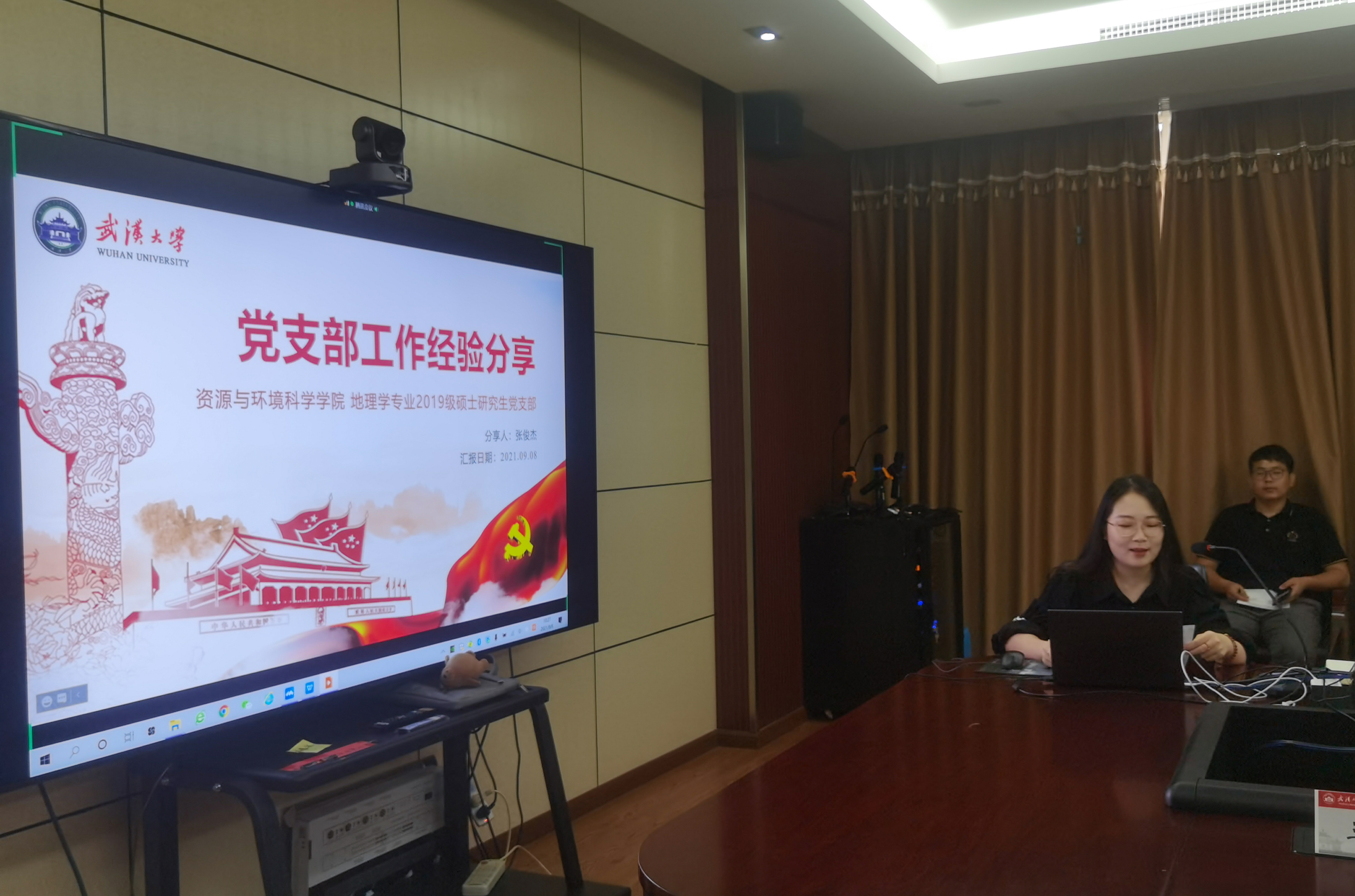 然后,2019级地理学专业硕士研究生党支部书记张俊杰分享了工作经验。她表示一个支部就是一座堡垒,一名党员就是一面旗帜,各党支书要坚定理想信念,明确责任担当,扎实理论知识,提高业务能力,严格遵守组织纪律,全心融入党支部,充分发挥研究生党支部的战斗堡垒作用和党员的先锋模范作用。