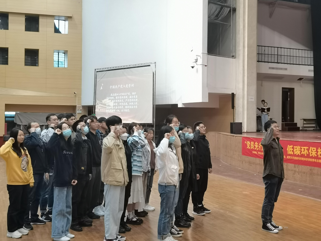 活动开始,地理科学与国土资源系研究生第五党支部书记程鹏带领本支部的预备党员与其他支部的党员与预备党员一起重温入党誓词,宣读承诺倡议书,并在“党员先行创分类 ,低碳环保校园行”党建活动的横幅上签字。