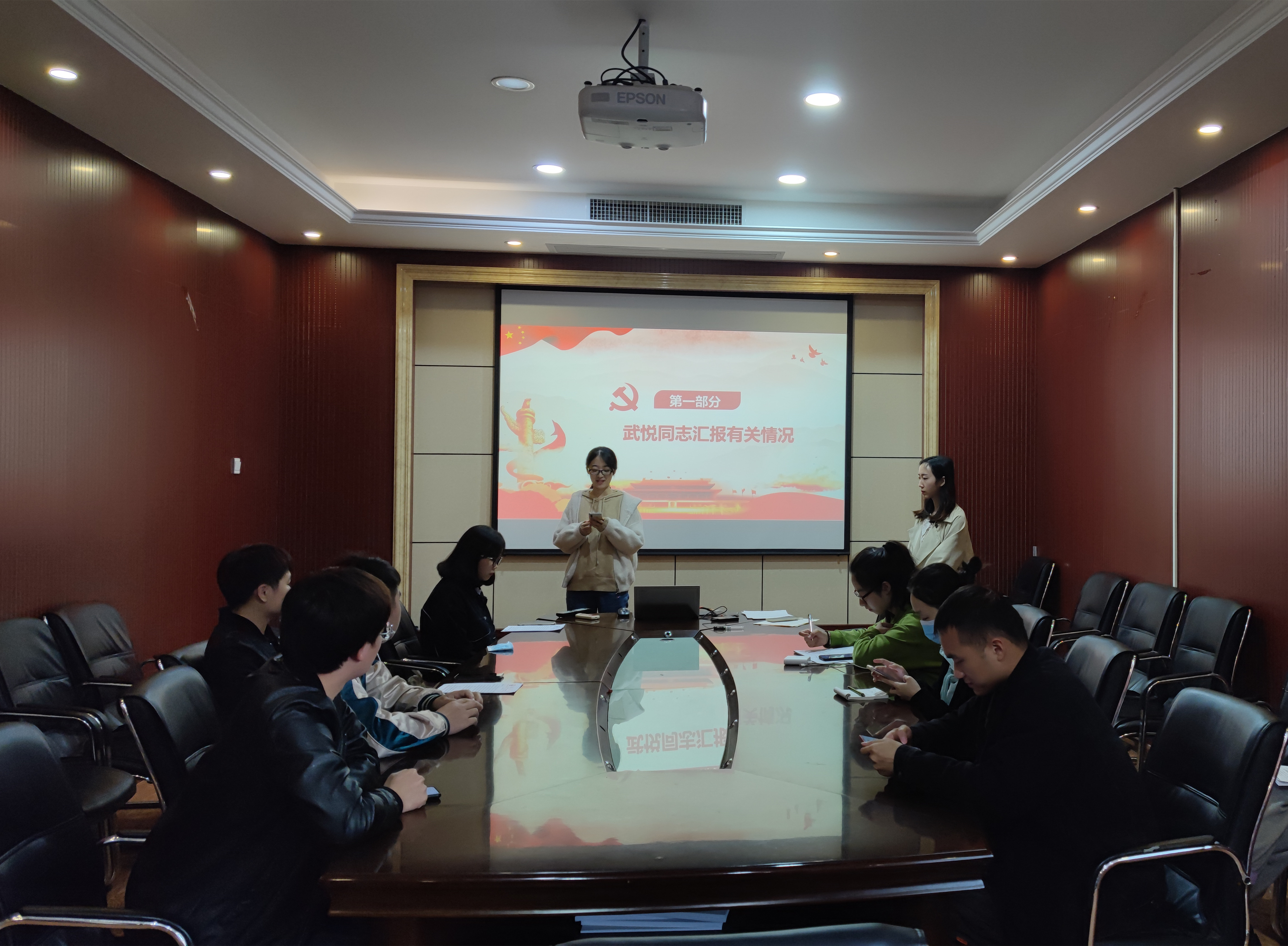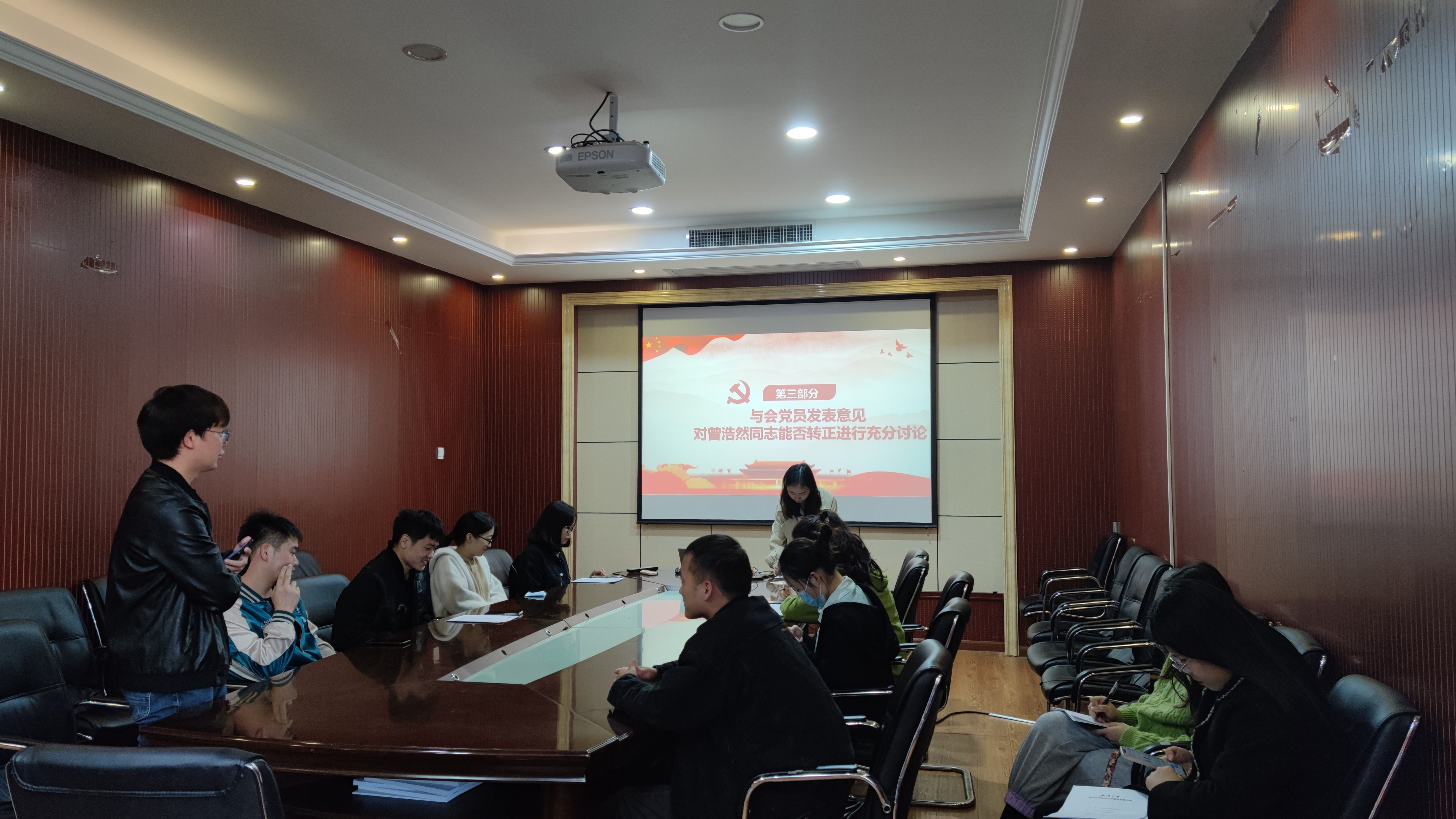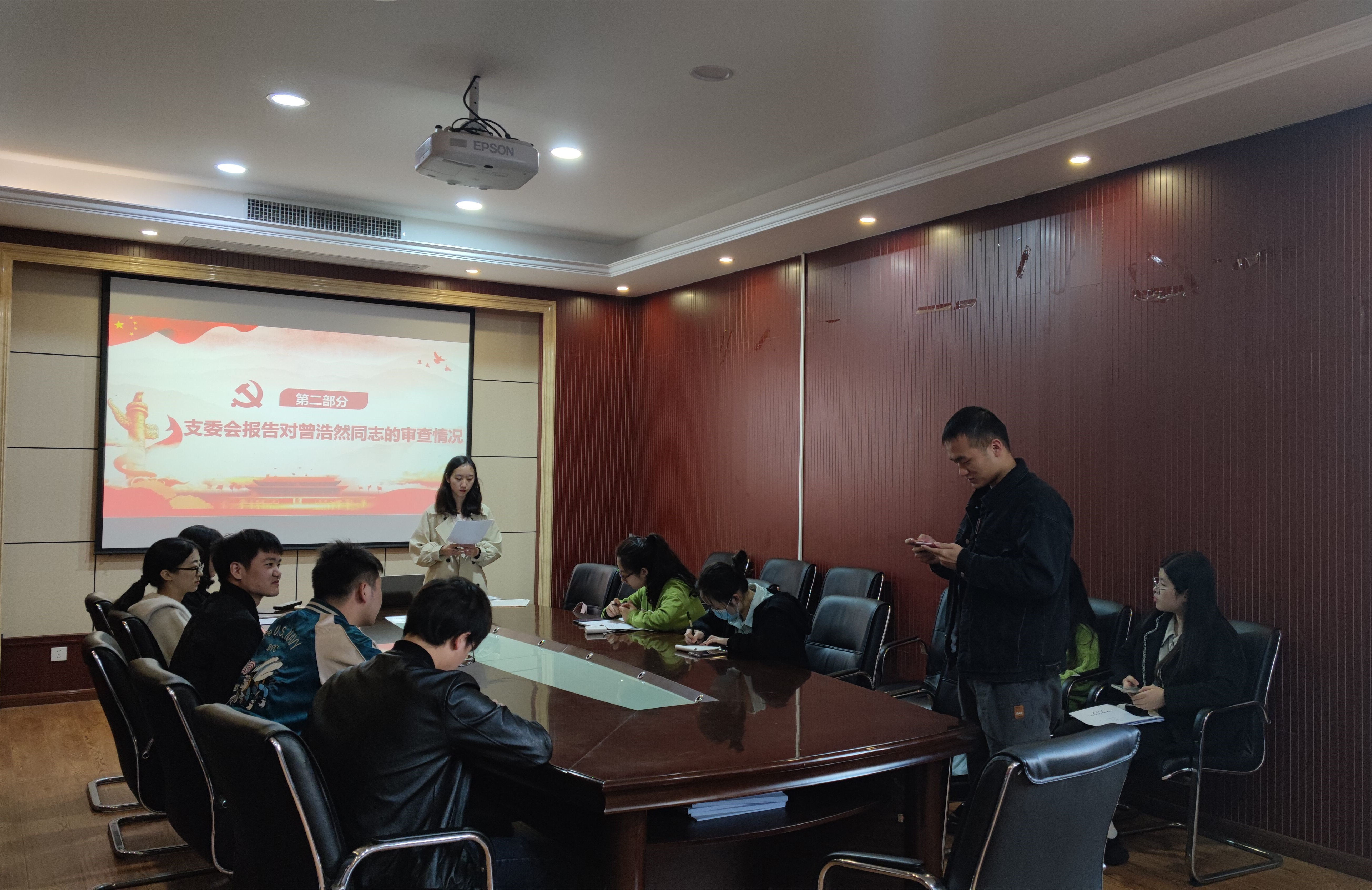 504会议室召开了支部大会。本次会议由支部书记罗明霞同志主持,主要内容包括曾浩然、武悦、郜清雯三位同志的预备党员转正讨论以及主题党日活动的召开。