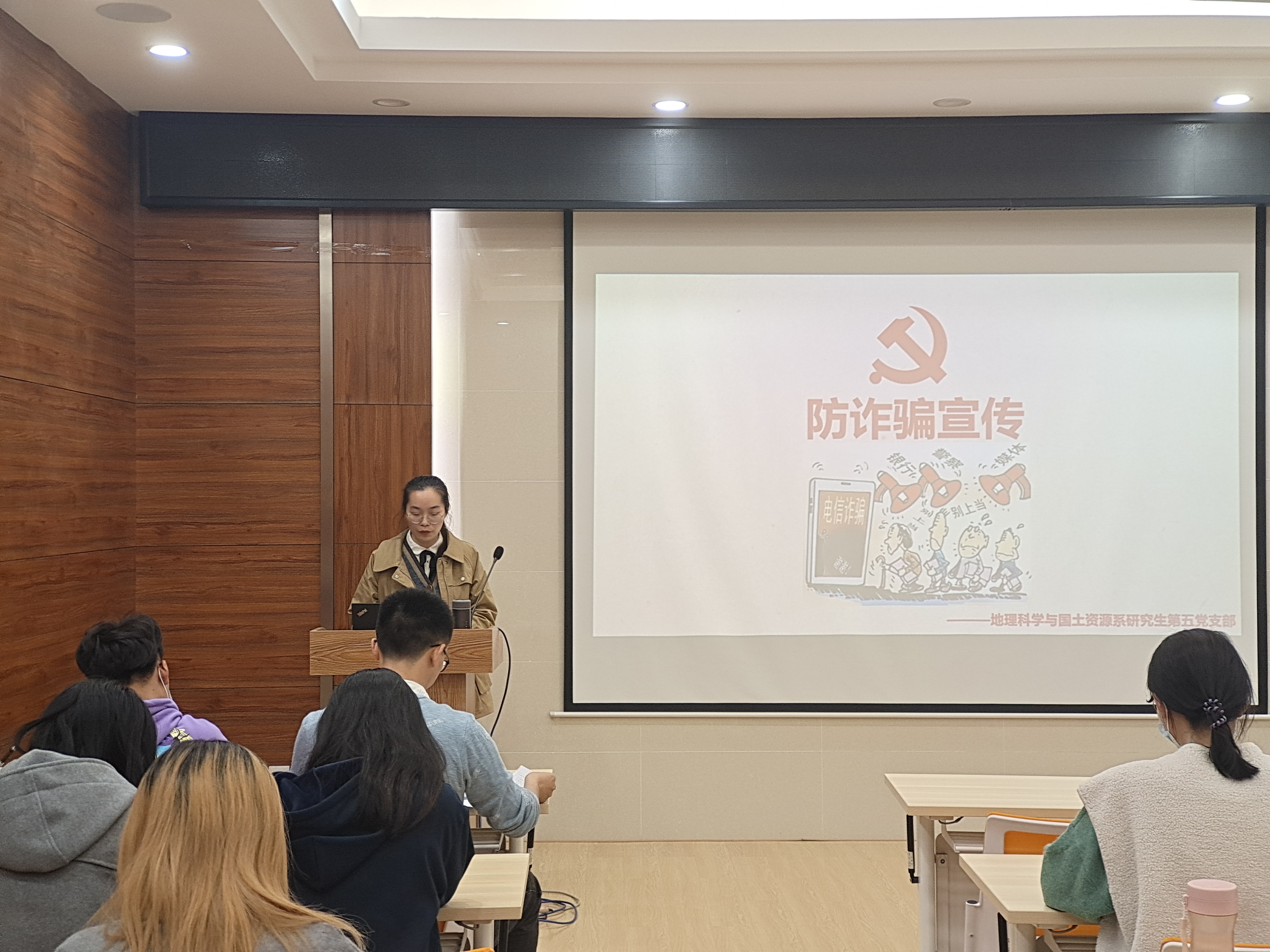 地理科学与国土资源系研究生第五党支部宣传委员朱丽芳将诈骗犯罪分子惯用的骗人手段进行总结,并介绍了现有的案例进行讲解,让同学们对诈骗手段有了一定的了解和防范意识。