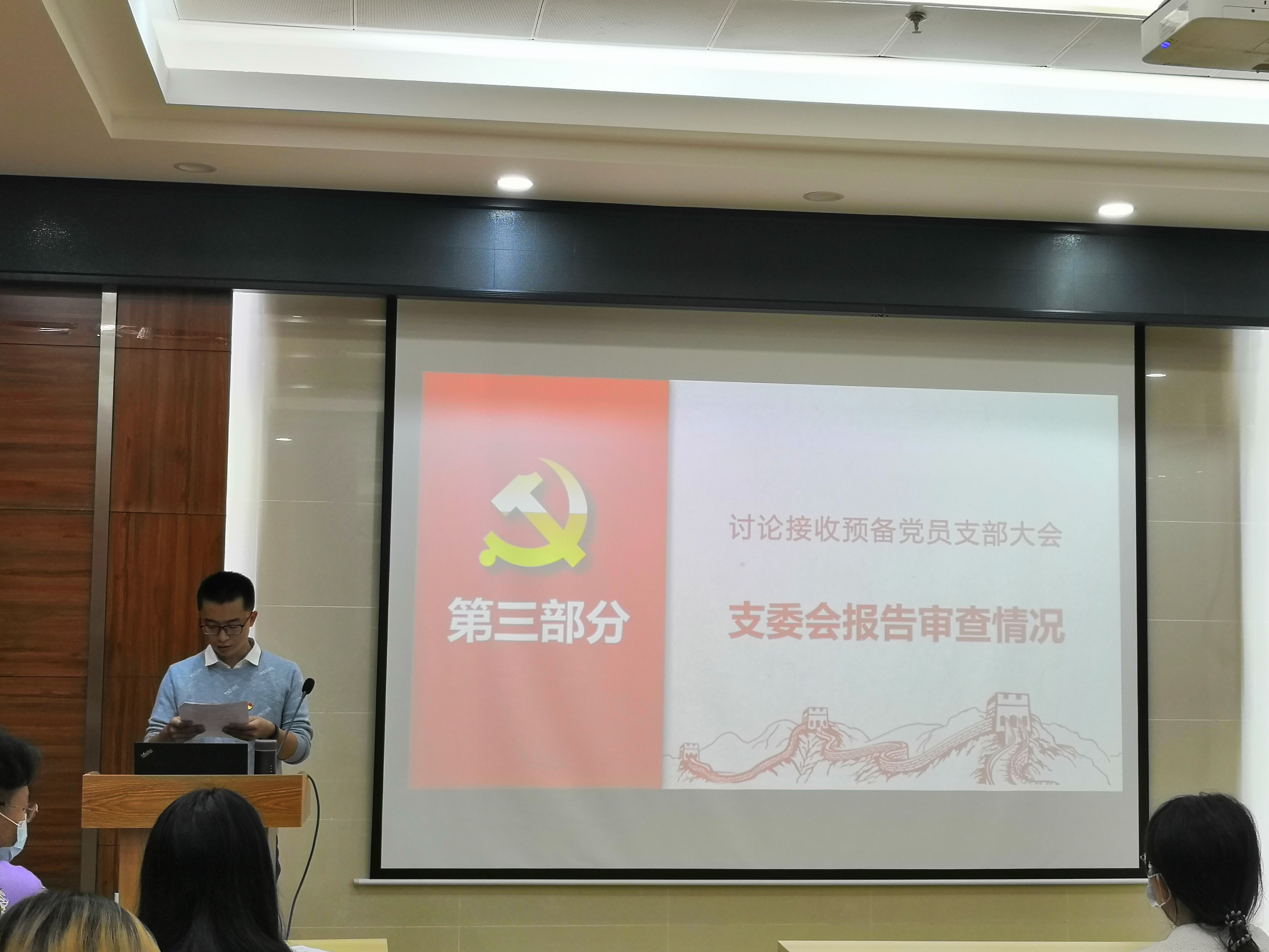 (三)会议第三项,支委会报告审查情况。党支部书记程鹏同志代表支部委员会报告对董玥、邵丽冰、张舒瑾三名同志的审查情况。