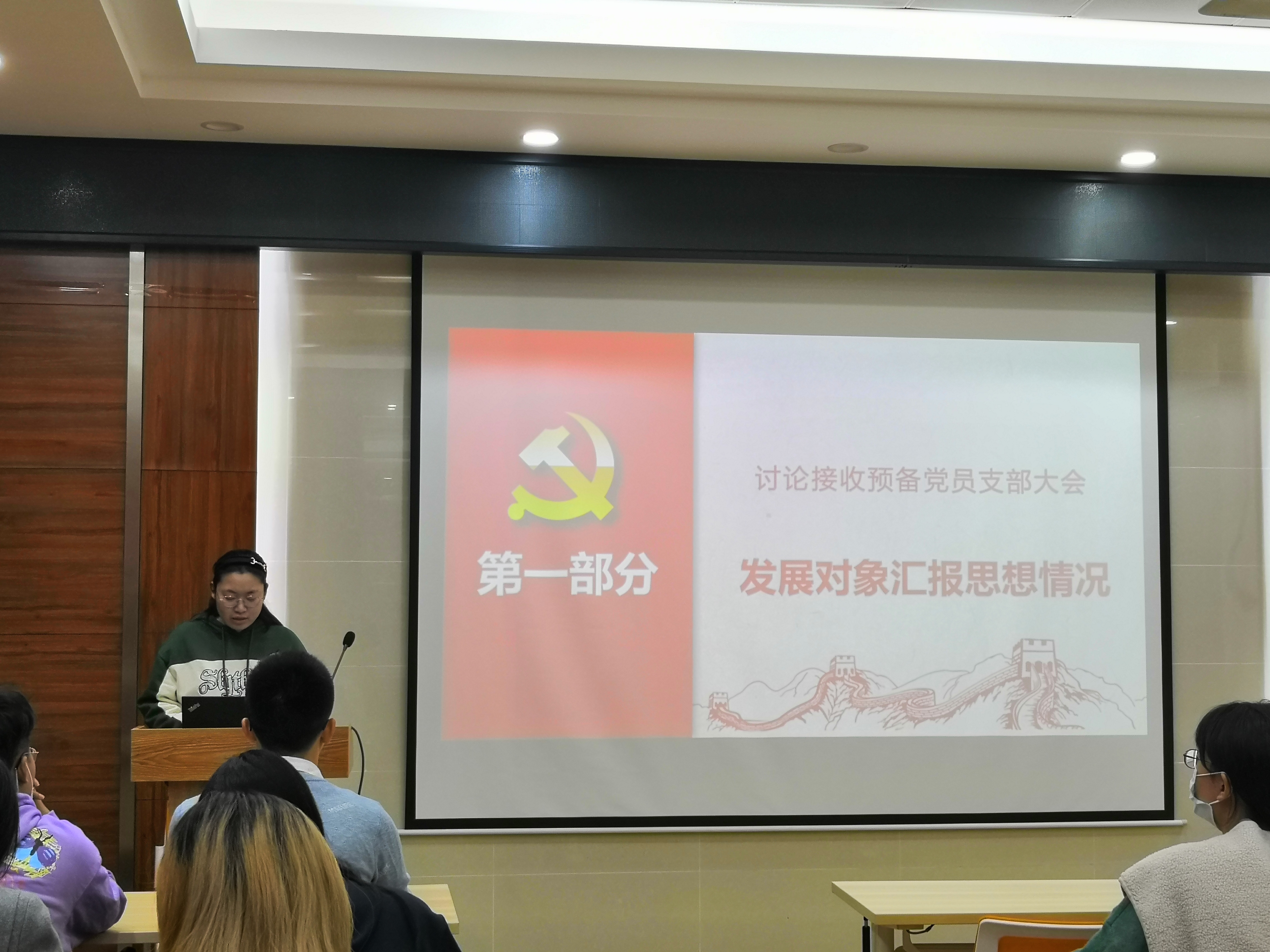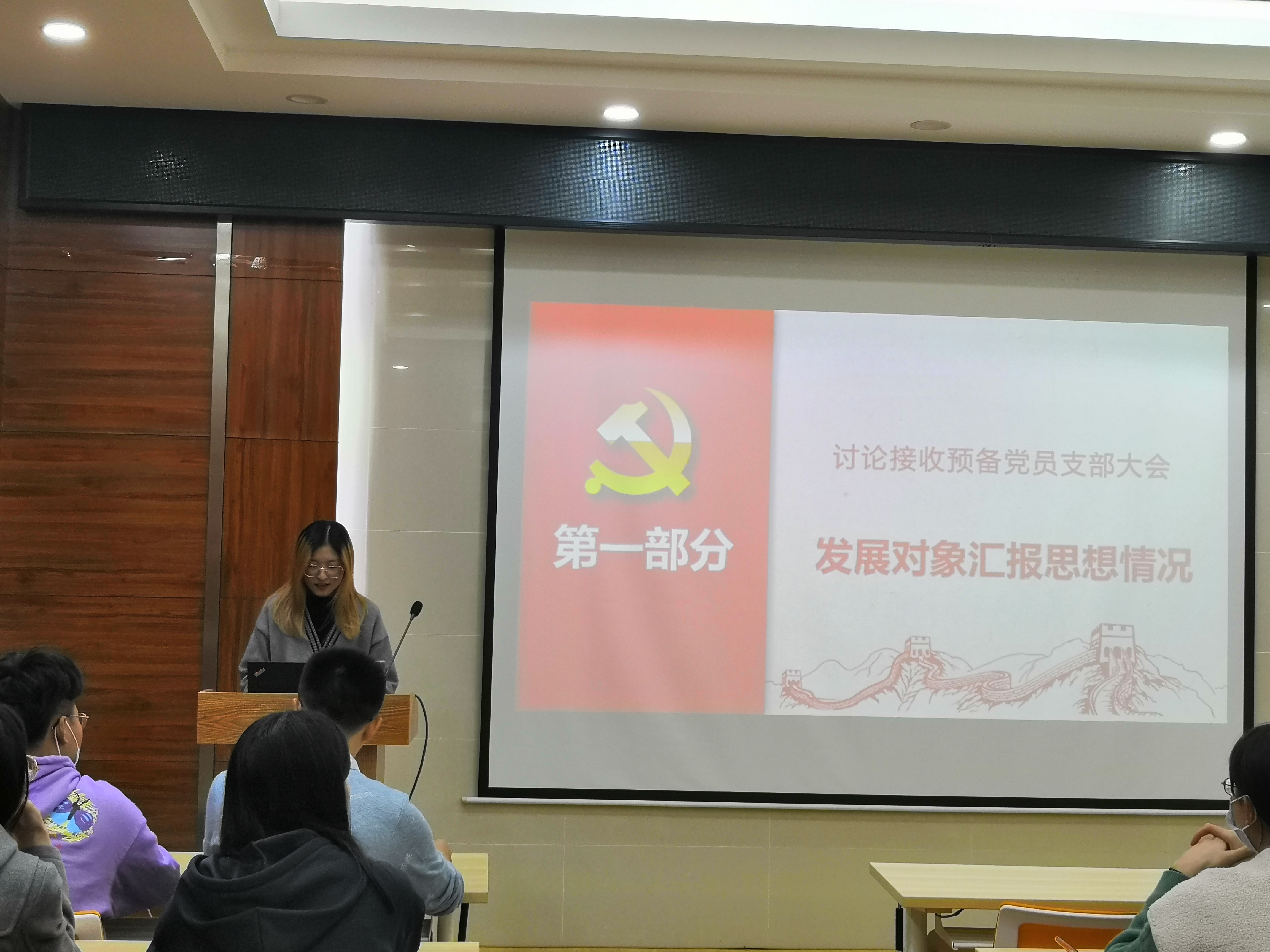 (一)会议第一项,发展对象汇报思想情况。董玥、邵丽冰、张舒瑾三名同志依次汇报了对党的认识、入党动机、本人履历、家庭成员和主要社会关系情况、现实表现、以及需向党组织说明的其他问题。
