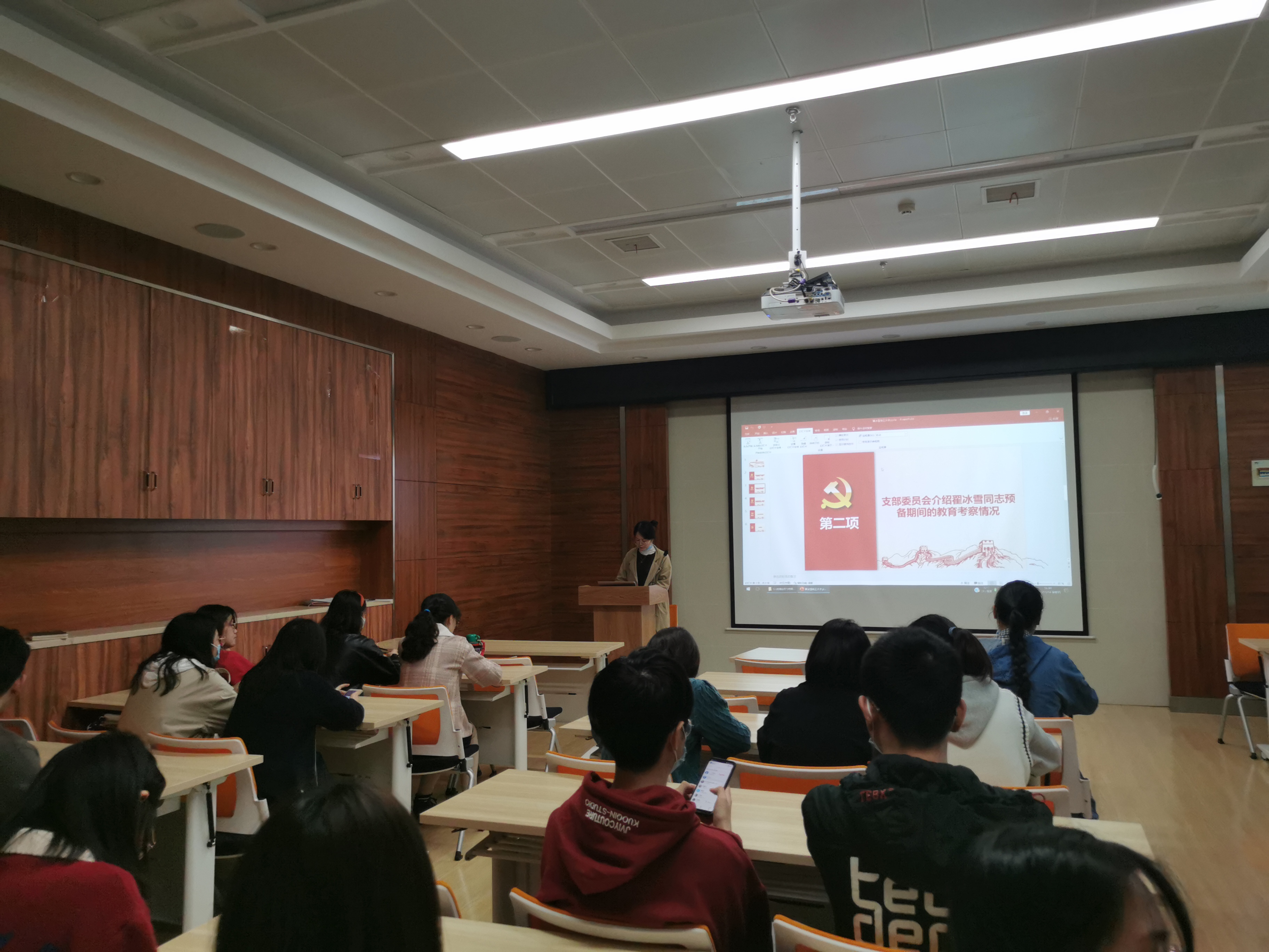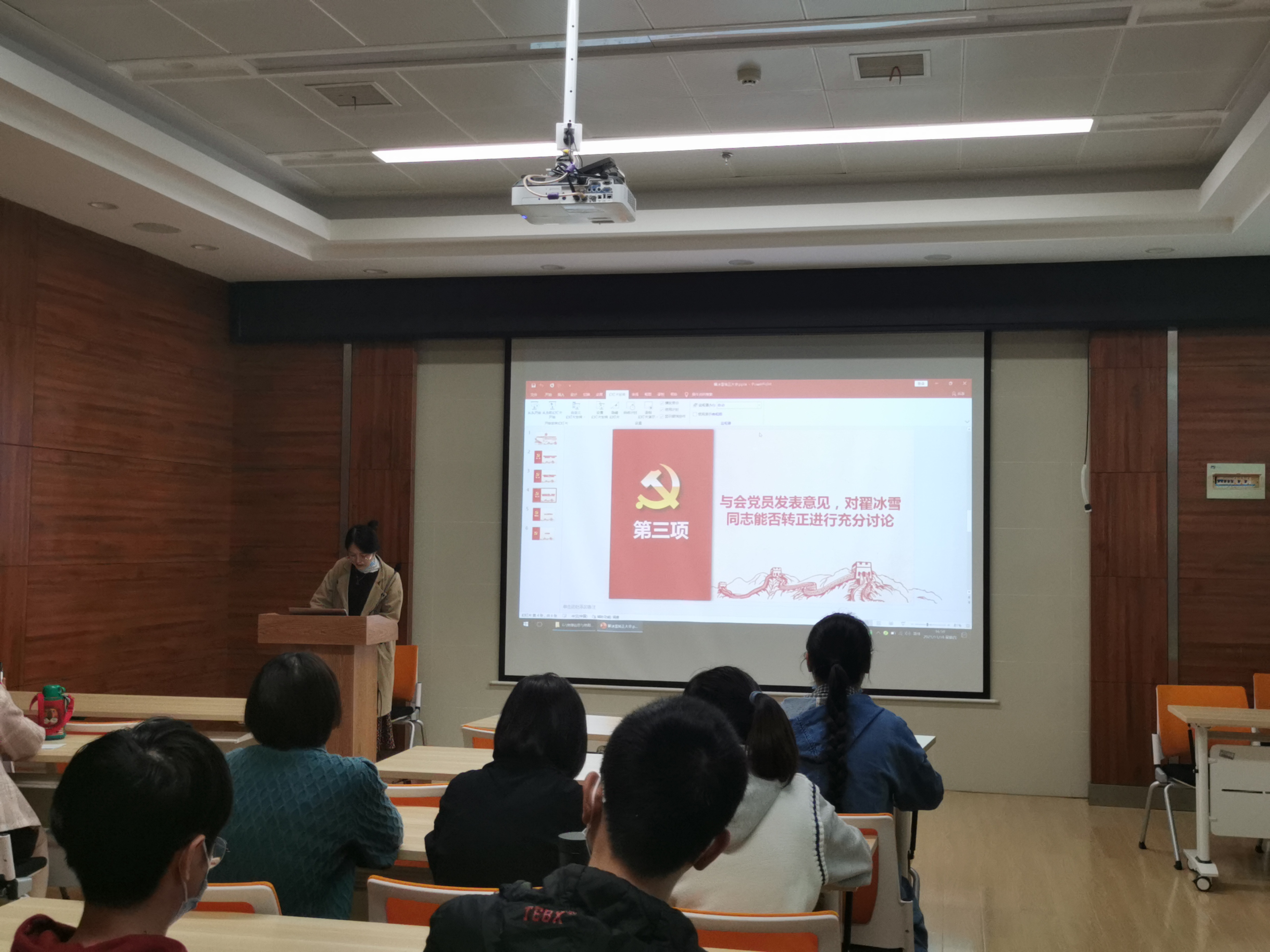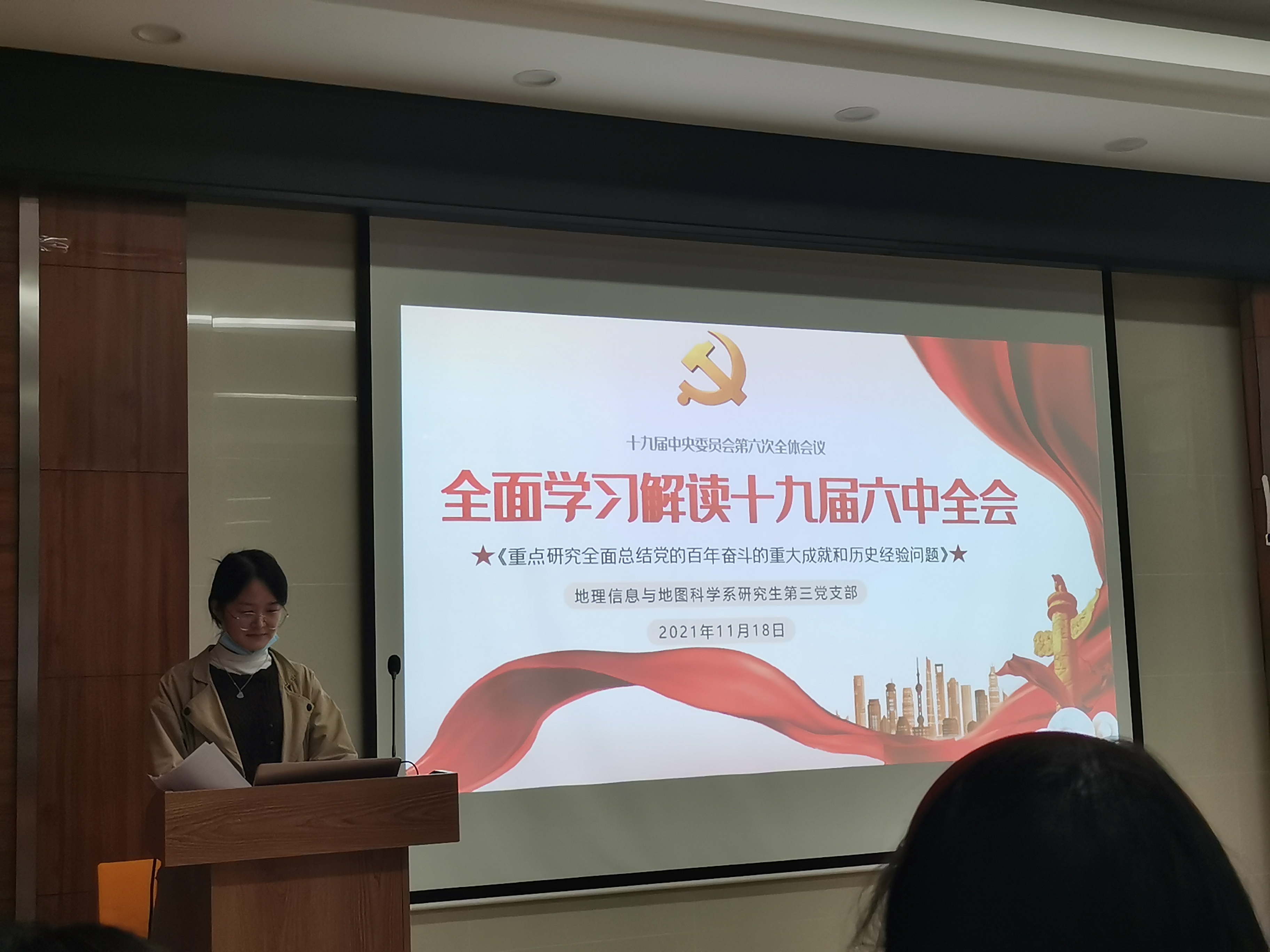 2021年11月18日下午四点半,地理信息与地图科学系研究生第三党支部于电脑城429会议室召开“全面学习解读党的十九届六中全会”主题党日学习活动暨预备党员转正大会。本次会议由支部书记张梦同志主持,主要讨论关于预备党员翟冰雪同志的转正问题。