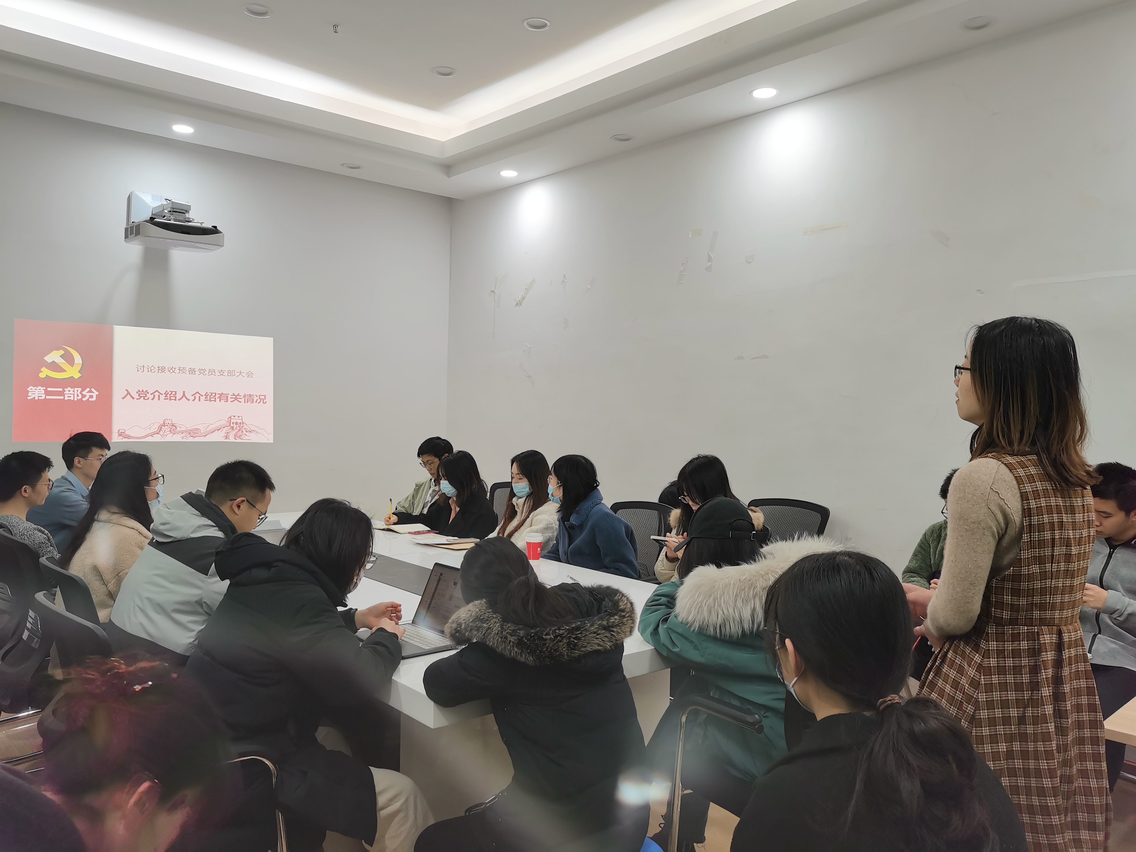 会议第一项,支部对接收李晓忠同志为中共预备党员进行讨论。首先,李晓忠同志汇报了基本情况、入党动机;其次,入党介绍人介绍有关情况,表达了对李晓忠同志入党的建议,推荐其入党;随后,苏会钰同志代表支委会报告审查情况:李晓忠同志符合发展要求;然后与会党员发表意见,正式党员进行投票,全票通过同意接收李晓忠同志为预备党员;最后,新党员同志李晓忠表态,表达了时刻向党组织看齐,严格要求自我的坚定信念。