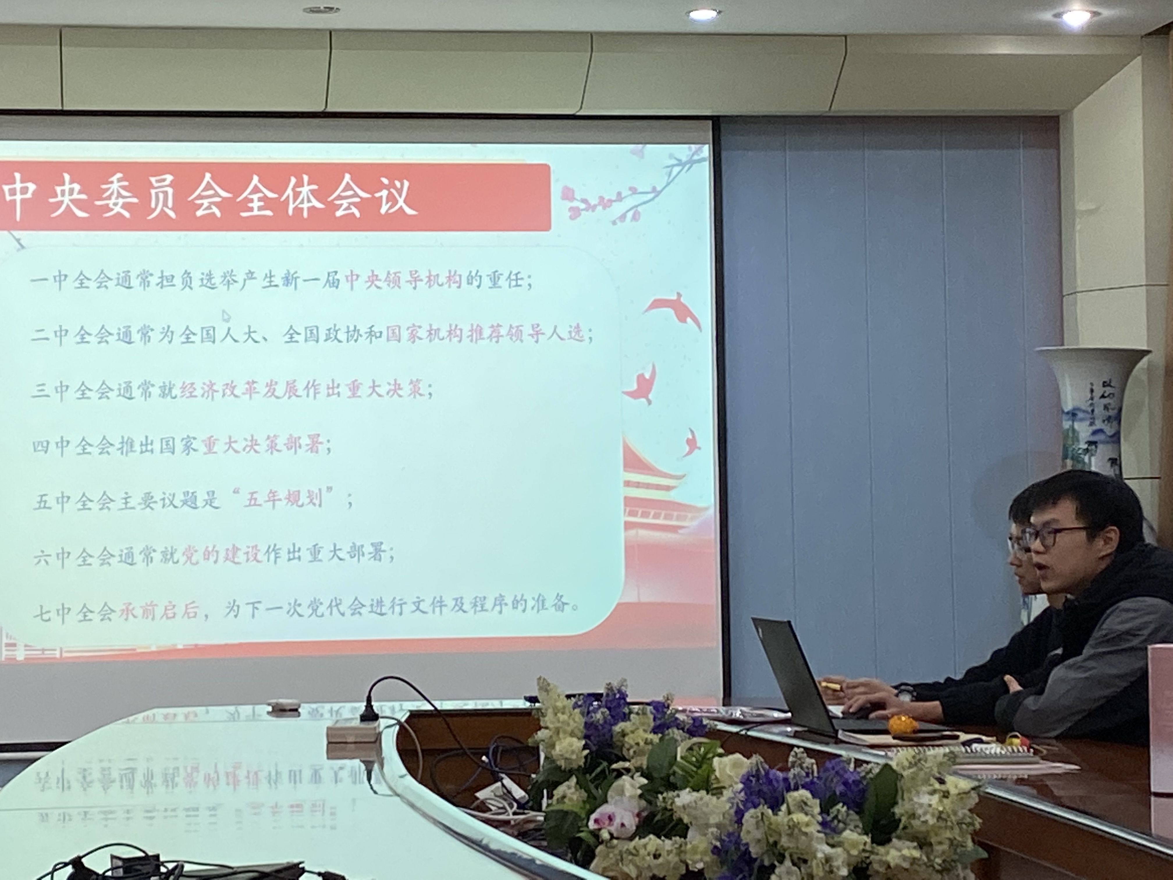 以史为鉴,能知兴替。廖克俊同志首先就历届中国共产党全国代表大会和重要中央委员会议做了简介,从会议时间、会议地点、会议内容和历史背景等角度简括十九次全代会并从会议设置的角度说明了会议执行的科学性和系统性。他总结道,南湖的航船上,一大向世界宣告,中国人民从此有了坚强的领导核心;延安的窑洞里,七大总结经验,团结全党,为全面胜利做好准备;北京的礼堂里,党的十九大庄严宣布中国特色社会主义进入新时代。全国代表大会之间的中央委员会议,也对党和国家产生巨大影响。以时间为线串起了党的百年历史,让世人见证了中国人民从站起来到富起来,再到强起来的历史征程。