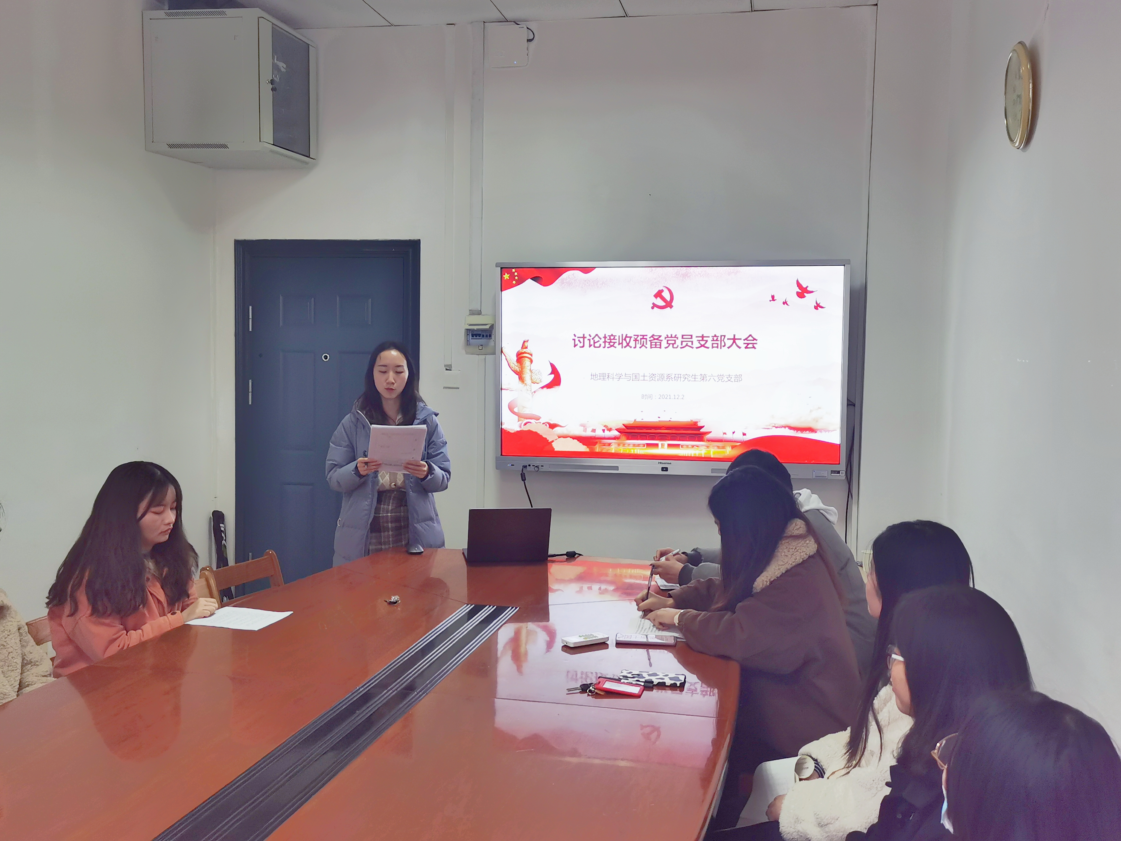 会议第一项,讨论接收曹敏雪同志为预备党员的工作。首先由曹敏雪同志汇报其对党的认识、入党动机和个人履历等情况;接着,入党介绍人谢璐励同志介绍发展对象有关情况;然后,支委会代表谢璐励向支部大会报告曹敏雪同志考察期间的积极表现,认为其符合共产党员的标准;经与会党员充分发表意见与不记名投票,书记罗明霞同志宣布曹敏雪同志全票通过接收成为中共预备党员。最后,曹敏雪同志做出了表态,向党组织表达了自身的想法与加入中国共产党的决心。