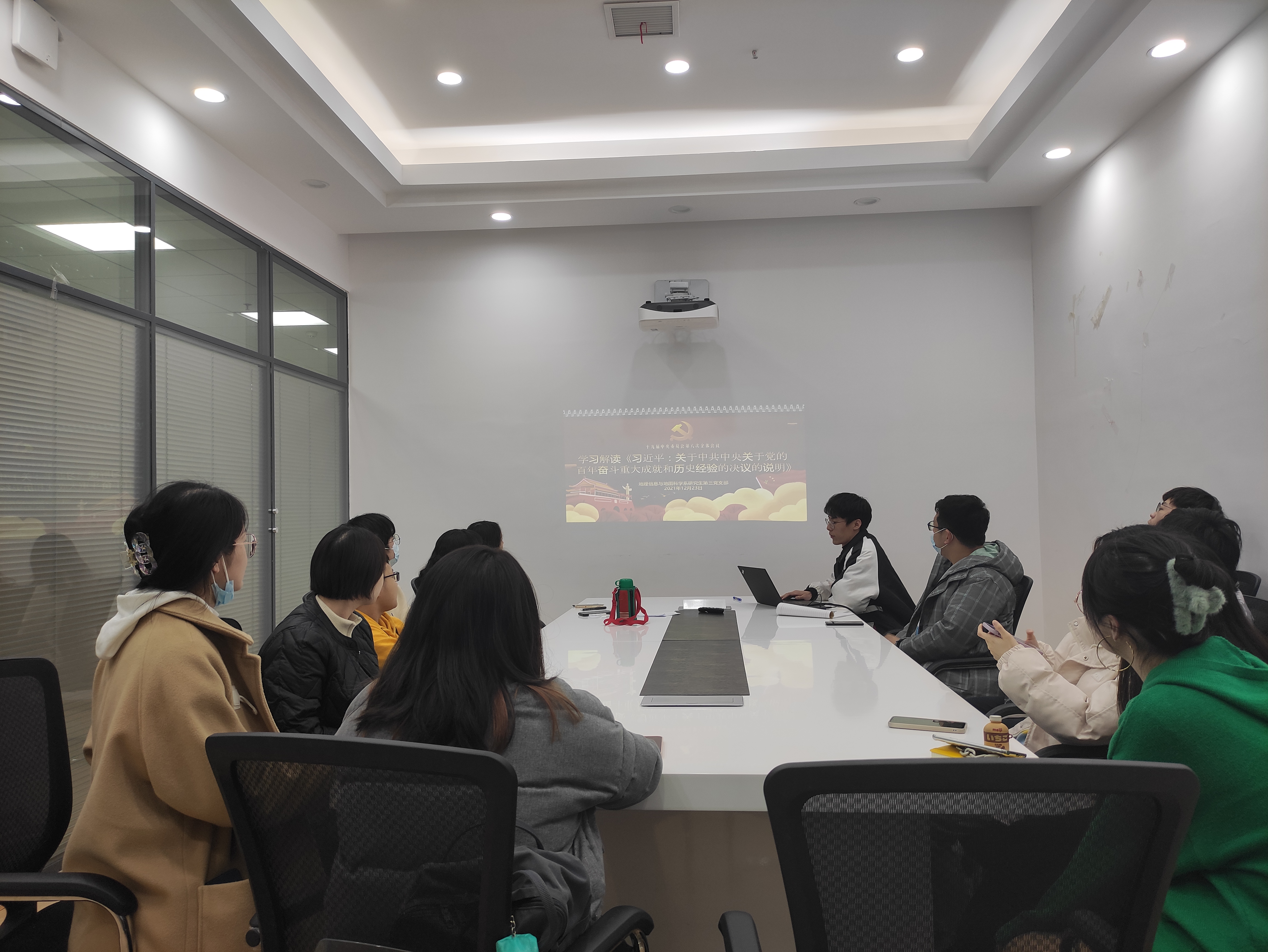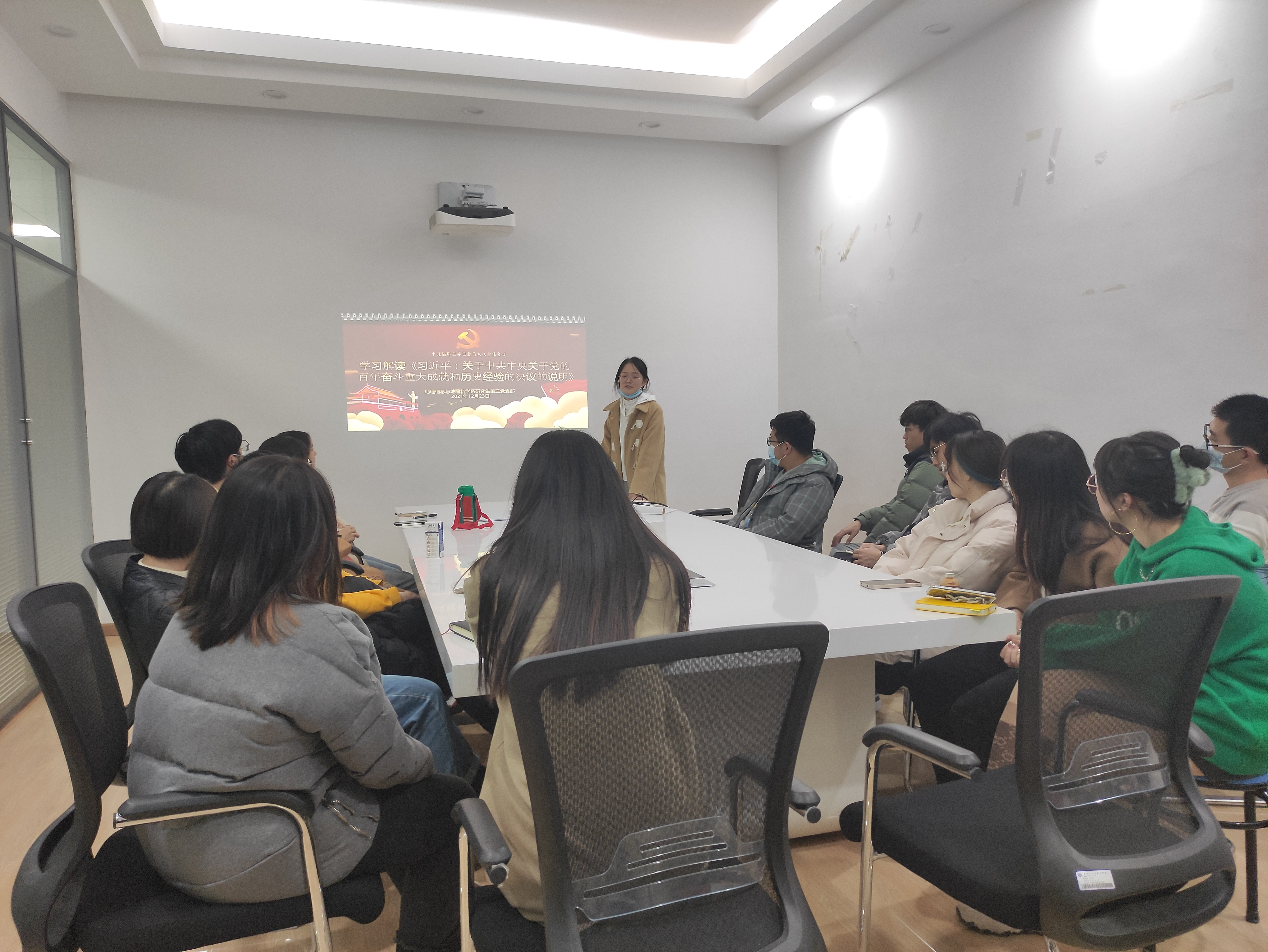 会议第一项,学习解读《习近平:关于中共中央关于党的百年奋斗重大成就和历史经验的决议的说明》。首先由辛成同志介绍《中共中央关于党的百年奋斗重大成就和历史经验的决议》的内涵和重大意义,并从我党历史上两个重要历史决议出发,分析高度注重总结历史经验,对回顾过去,展望未来具有特别重要的指导意义。之后,辛成同志讲解了决议的基本框架和主要内容,强调要树立目标、坚定信念,号召支部同志们认真学习决议精神,要努力增强志气,做事不避难的社会主义建设者;增强骨气,做义不逃责的新时代奋斗者;增强底气,做志不求易的马克思主义者。最后,辛成同志进行总结:作为一名研究生,应当将在日后的学习工作中坚持理论学习武装头脑、勤学苦练锻造专业本领,牢记党的宣传思想工作的光荣使命,争做党的辉煌事业先驱者。
