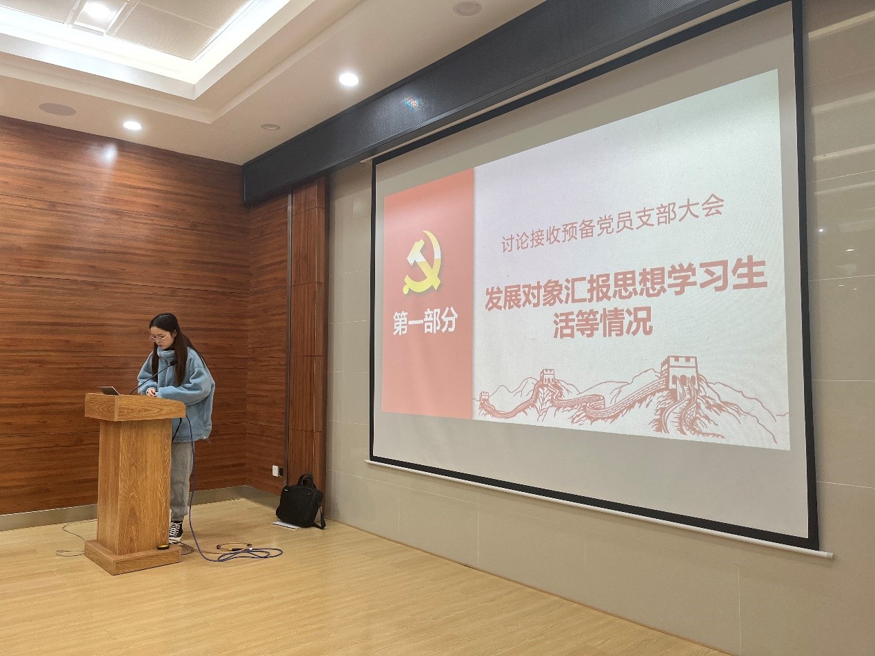 会议第一项,支部对接收梁欣欣、胡丹、王翔、李卓、肖妍、秦轶凡、陈人华同志为中共预备党员逐个进行讨论。首先,七位发展对象依次汇报了对党的认识、入党动机、个人基本情况等。随后,入党介绍人分别介绍相关情况,并对是否具备入党条件发表意见。然后,党支部书记汤慧玲同志代表支部委员会报告审查情况。紧接着,与会党员发表意见,正式党员进行无记名投票,对七名同志的赞成人数均超过应到会有表决权的正式党员的半数,同意接收其为预备党员。