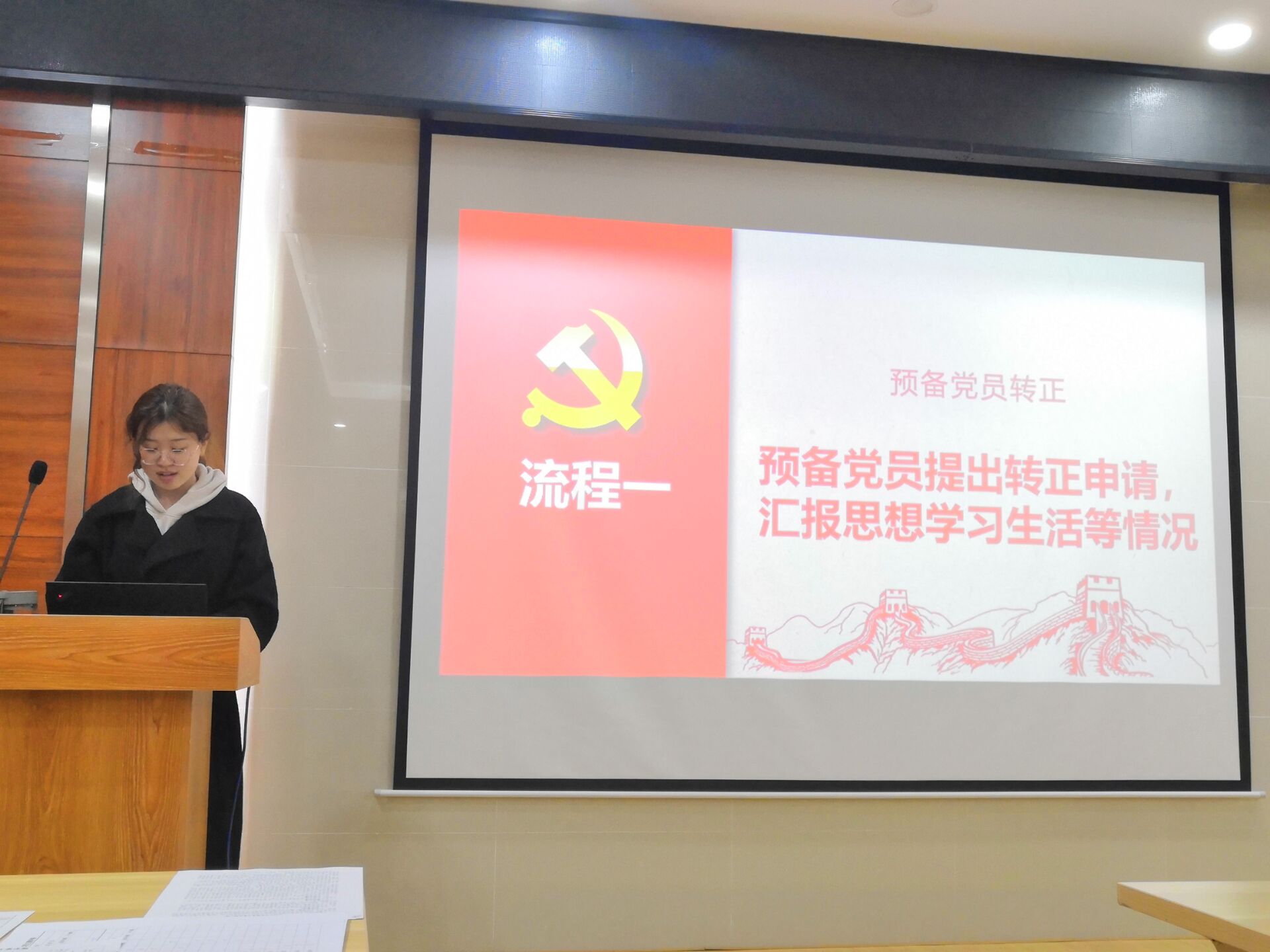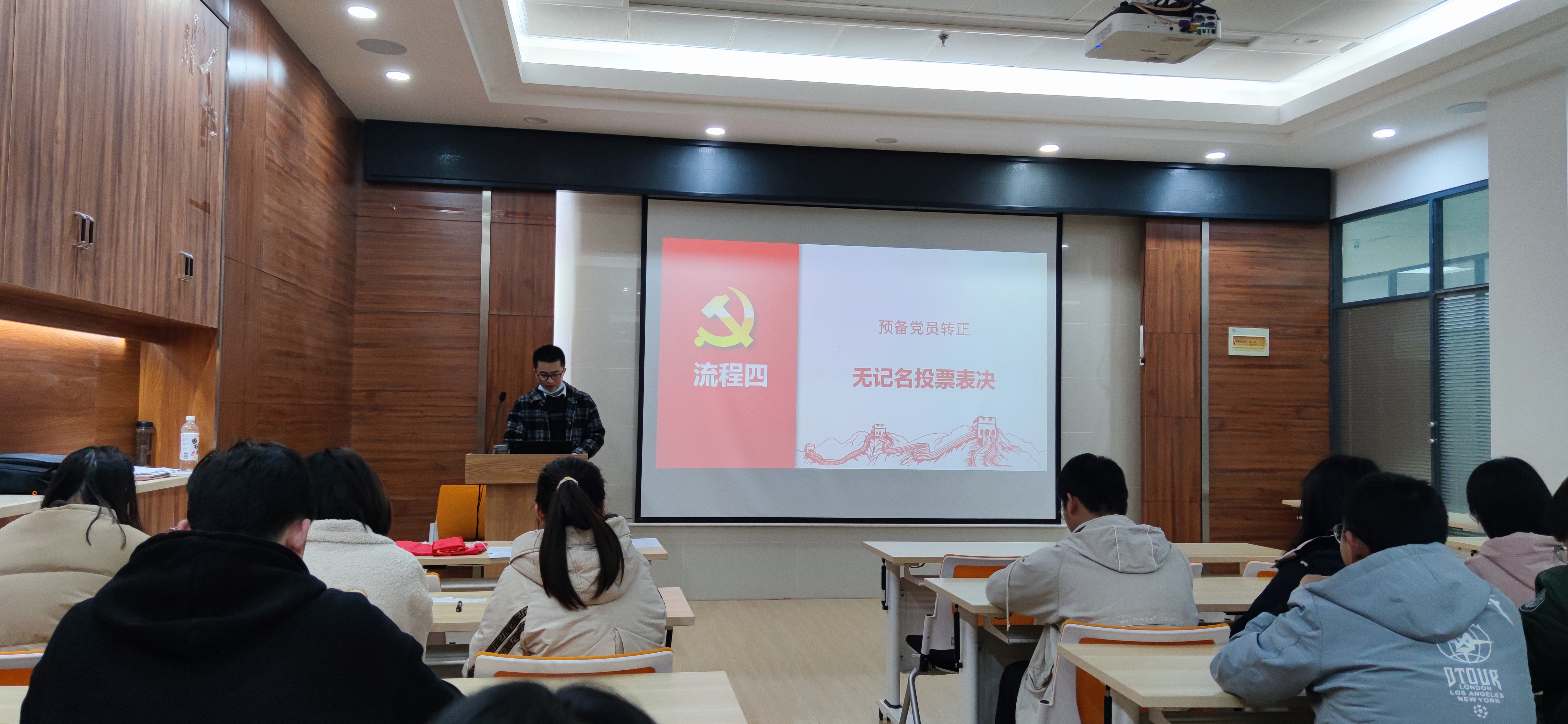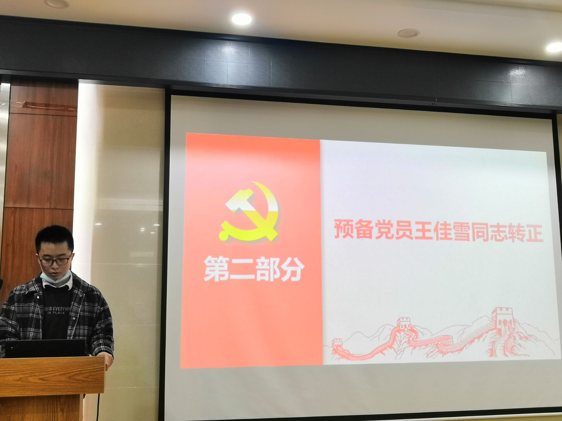 然后,由支委会代表程鹏同志向支部大会报告对王佳雪同志的审查情况,认为其符合转正条件;经与会党员充分发表意见与不记名投票,党支部书记程鹏同志宣布王佳雪同志全票通过成为中共正式党员。