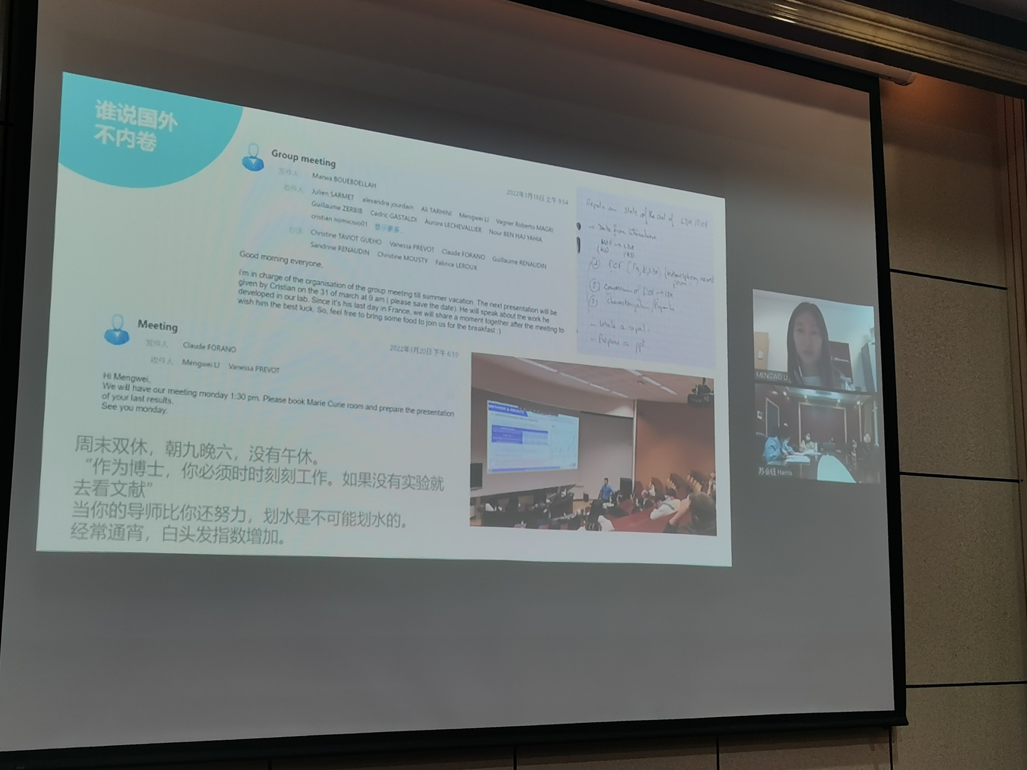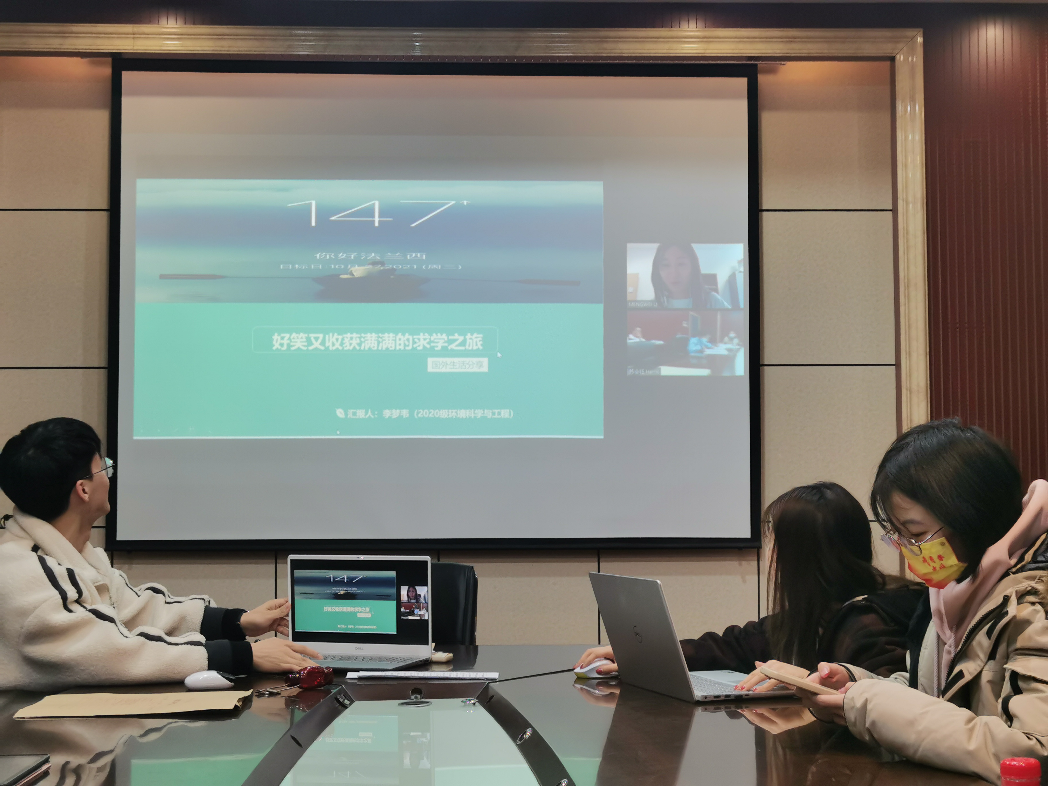 会议第三项,连线支部成员李梦韦分享出国交流的学习情况和心得体会。李梦韦同志是2020级环境科学专业博士,目前在法国进行联合培养,在会议上她与大家分享了生活和学习上的新体验,也表达了对祖国和国内生活的想念,支部成员们表达了对李梦韦同志的关心和美好祝愿。