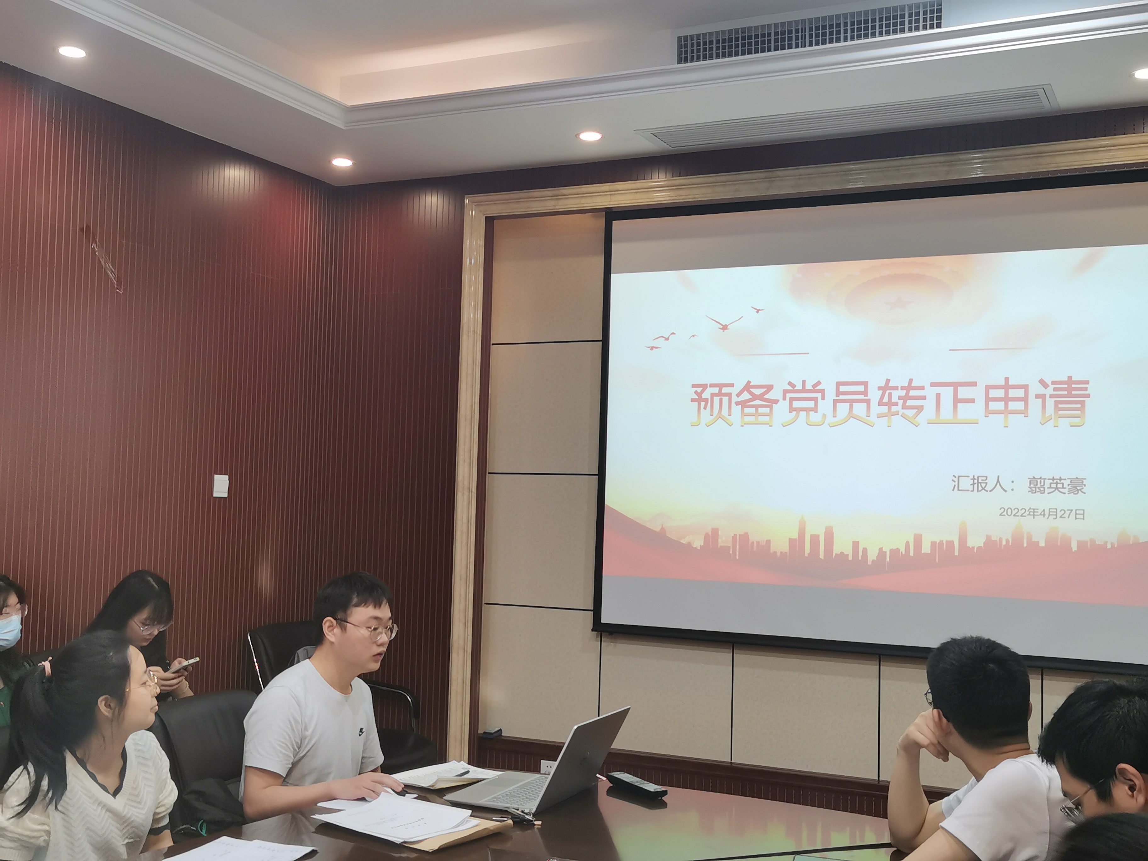 会议第二项,逐个讨论预备党员李昊、傅成翀、赵雨诗、张静贤、翦英豪共五名同志的转正申请。首先,由预备党员李昊、傅成翀、赵雨诗、张静贤、翦英豪分别向党支部汇报在预备期内的思想情况,介绍了科研学习和生活上的表现并进行总结与反思。由培养考察人汇报考察情况,与会正式党员发表意见,对五名同志的表现给予肯定。随后由正式党员进行无记名投票,同意23票,反对0票,弃权0票。由党支部书记苏会钰宣读大会决议,同意李昊、傅成翀、赵雨诗、张静贤、翦英豪同志的转正申请,如期转为中共正式党员。由苏会钰同志带领大家宣读了入党誓词。