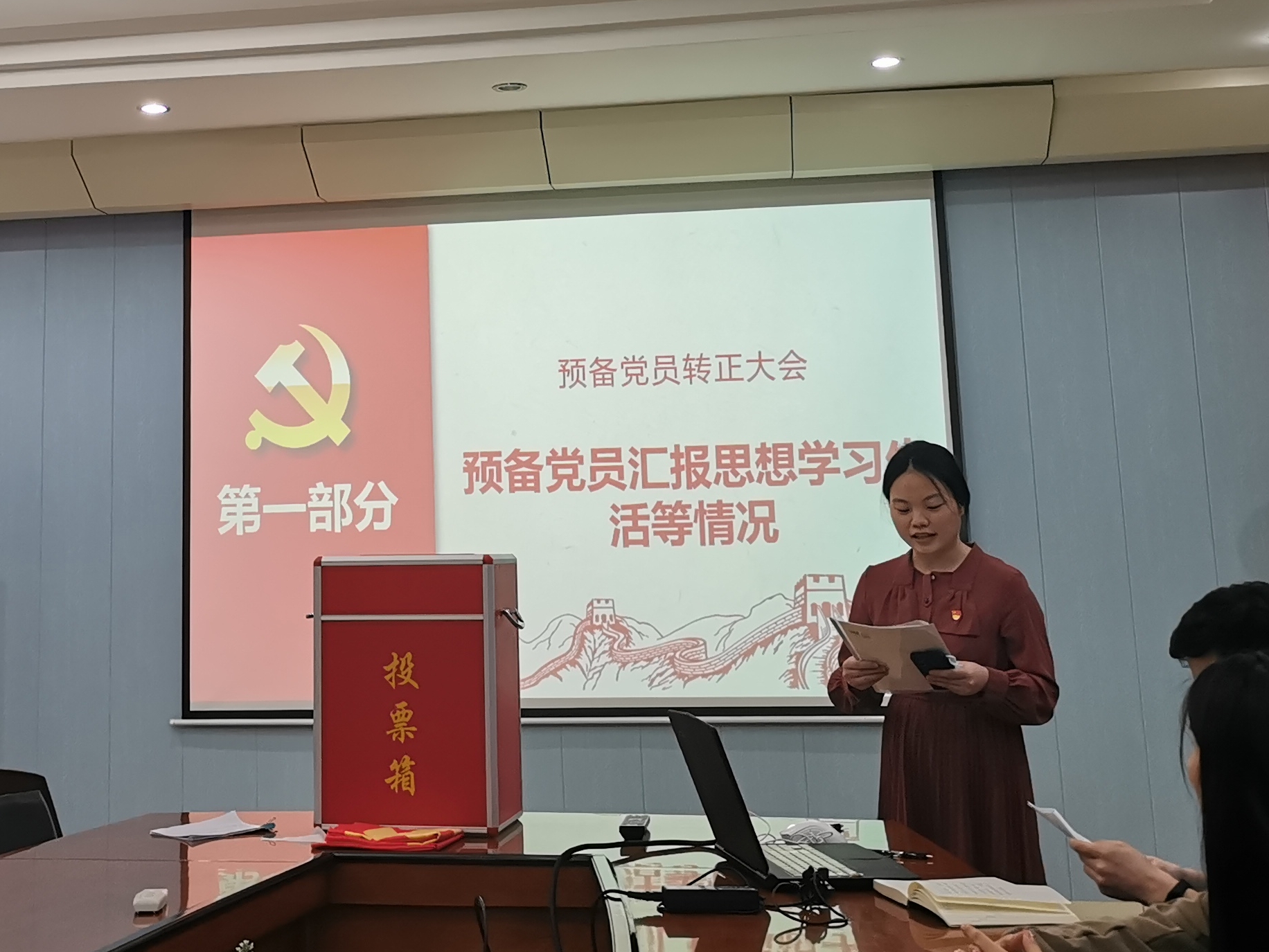 接下来,曾珍同志的培养考察人王萌同志汇报了考察情况,对曾珍同志预备期间的各方面表现给予了肯定,同意其按期转正。然后,由郑传帮同志代表支委会向支部大会报告对曾珍同志的教育考察情况,认为曾珍同志符合转正条件。与会党员也对曾珍同志的转正申请进行了充分的讨论。随后由正式党员进行无记名投票并现场公示投票结果,经表决,曾珍同志得到党支部大会的一致认可,同意其按期转为正式党员。