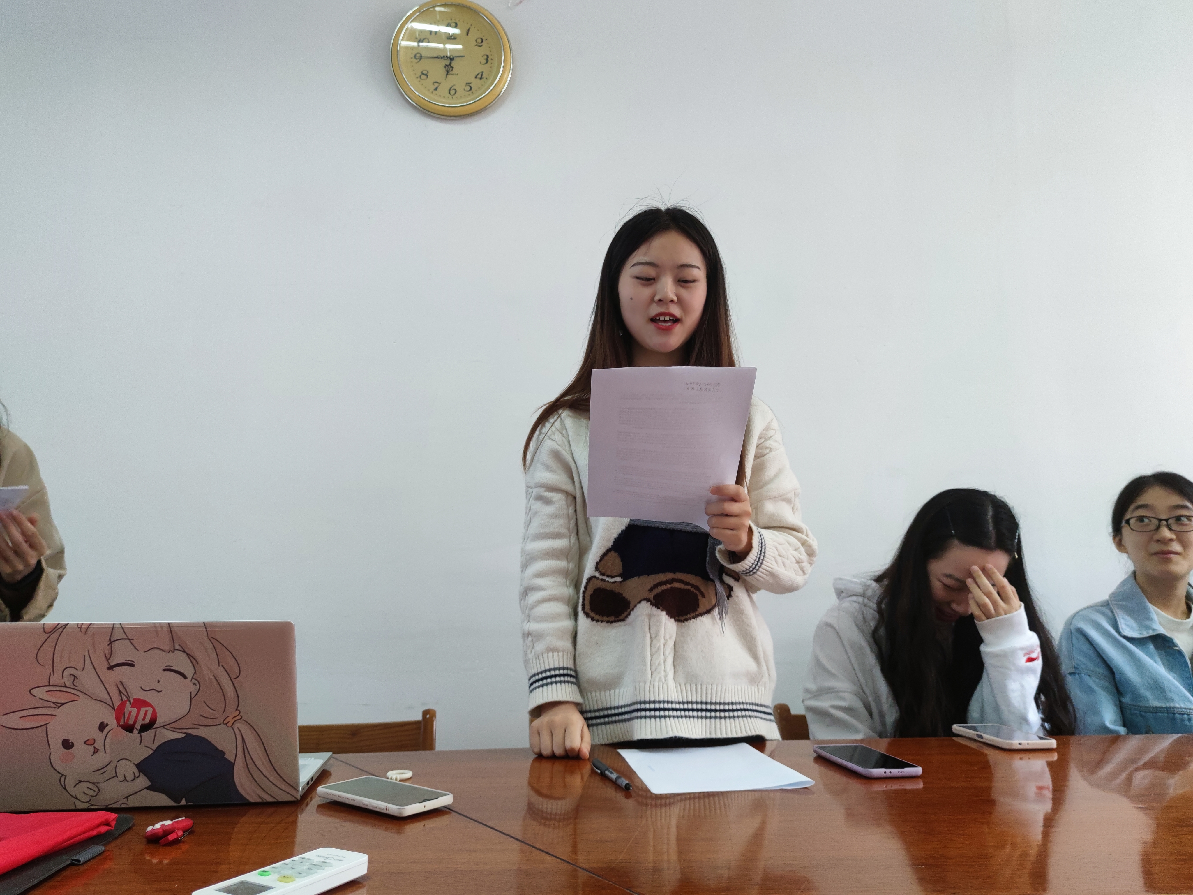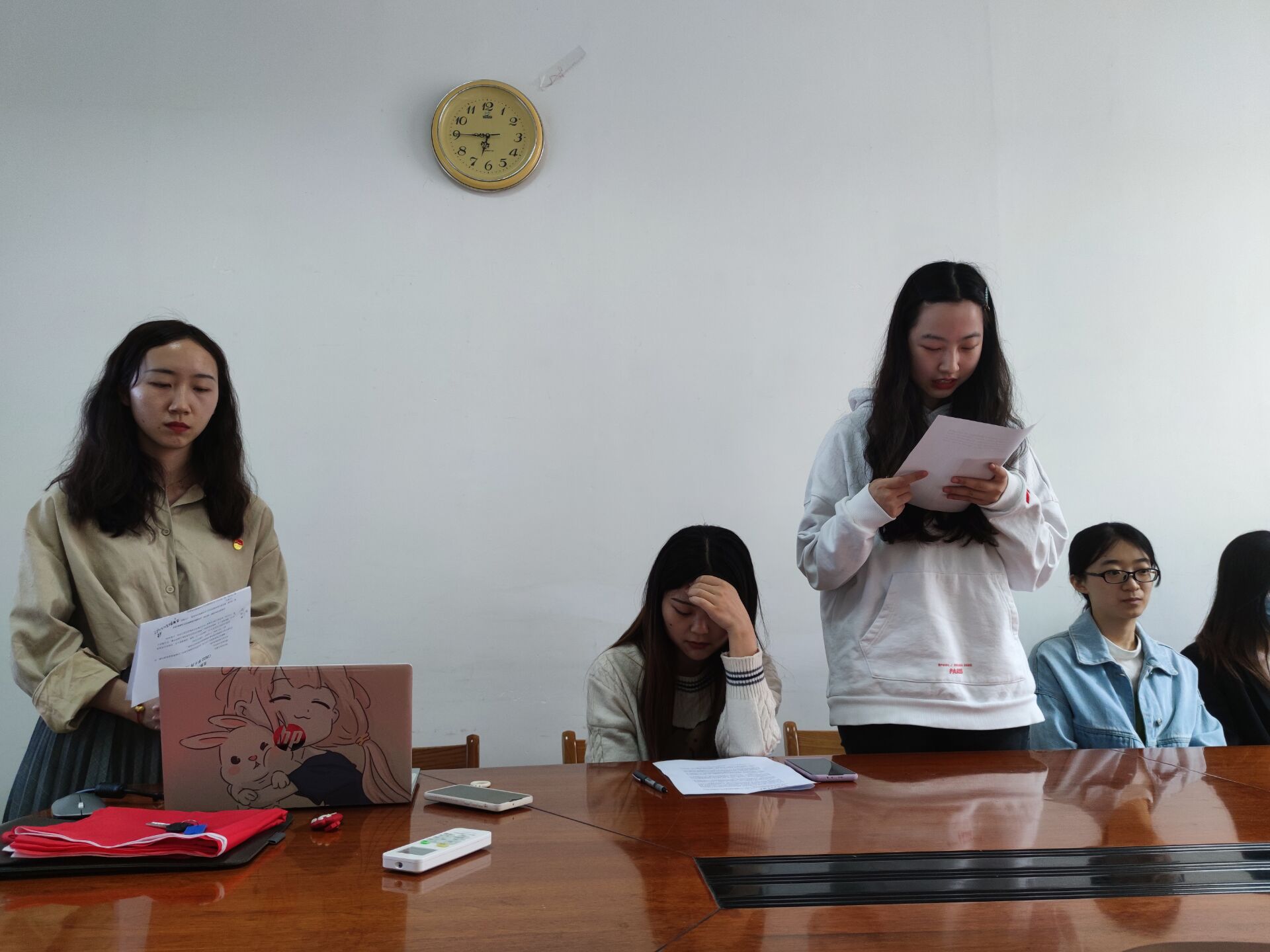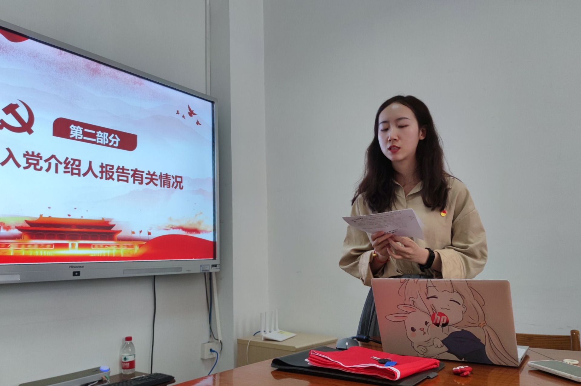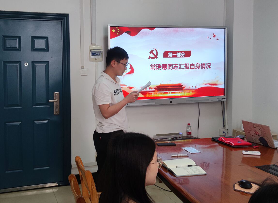 会议第一项,讨论接收常瑞寒同志为预备党员的工作。首先由常瑞寒同志汇报其对党的认识、入党动机和个人学习等情况;接着,入党介绍人王钰莹同志和罗明霞同志介绍发展对象在思想、学习、工作、生活等方面的情况;然后,支委会代表谢璐励同志向支部大会报告常瑞寒同志考察期间的积极表现,认为其符合共产党员的标准;经与会党员充分发表意见与不记名投票,书记罗明霞同志宣布常瑞寒同志全票通过接收成为中共预备党员。最后,常瑞寒同志做出了表态,向党组织表达了自身的想法与加入中国共产党的决心。