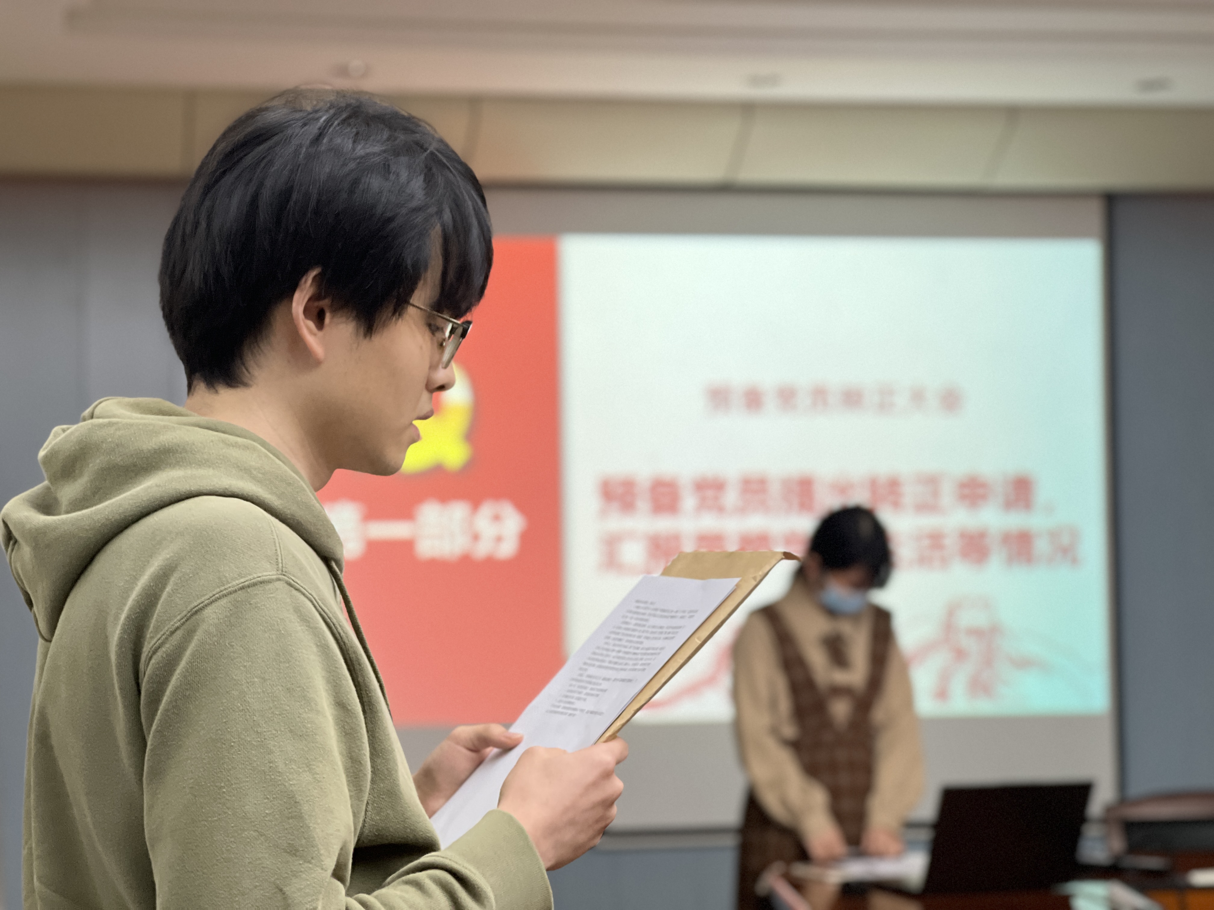 党支部大会首先讨论预备党员唐泽瑞同志的转正工作。预备党员唐泽瑞同志从理论学习、工作实践等方面汇报预备期间的思想、工作情况;接着由组织委员廖成同志代表支部委员会介绍唐泽瑞同志在预备期间的教育考察情况。
