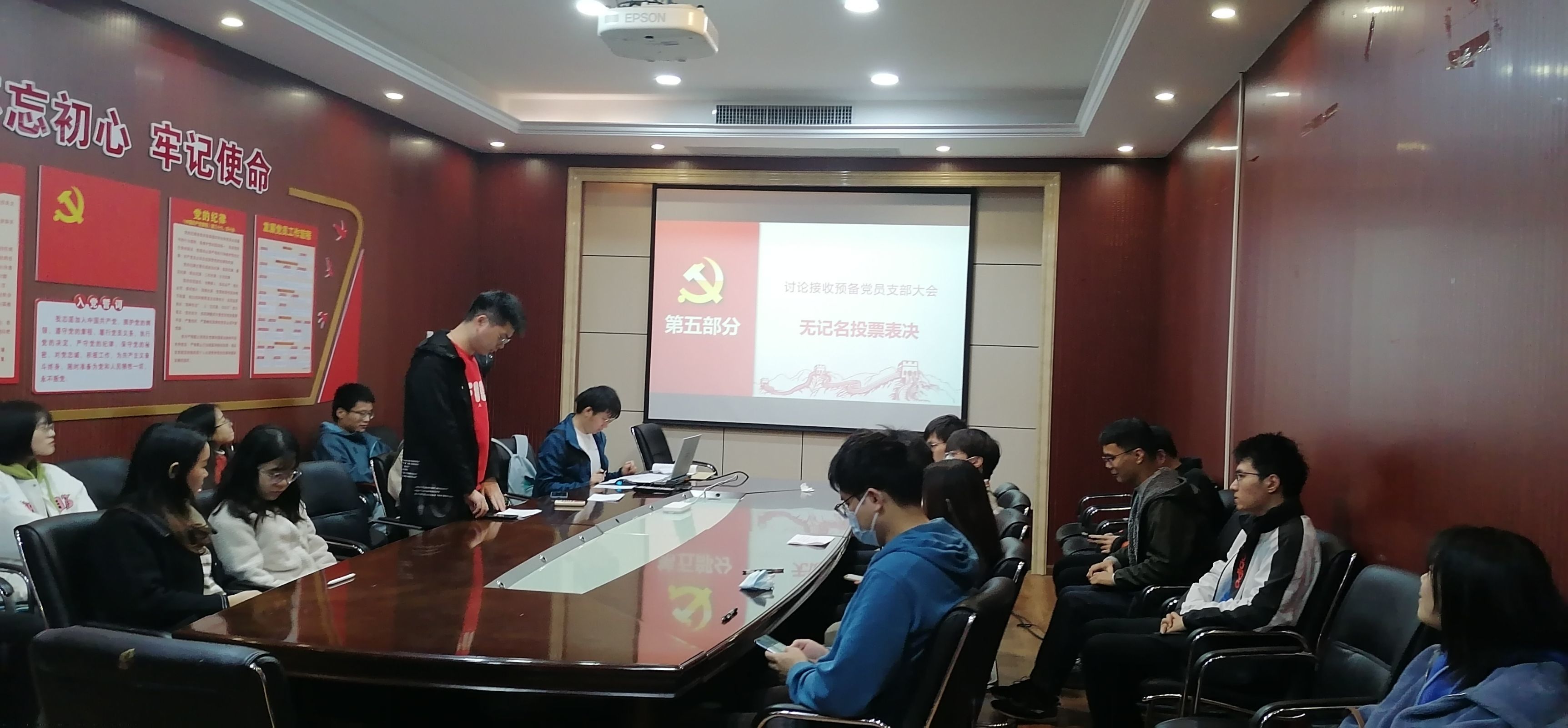 随后,参会的正式党员就朱俊杰同志与赵炜同志的接收申请进行无记名投票。经过监票人、计票人发票,在投票结束后对投票结果进行唱票,全体党员一致通过了接收朱俊杰同志与赵炜同志为预备党员的申请。