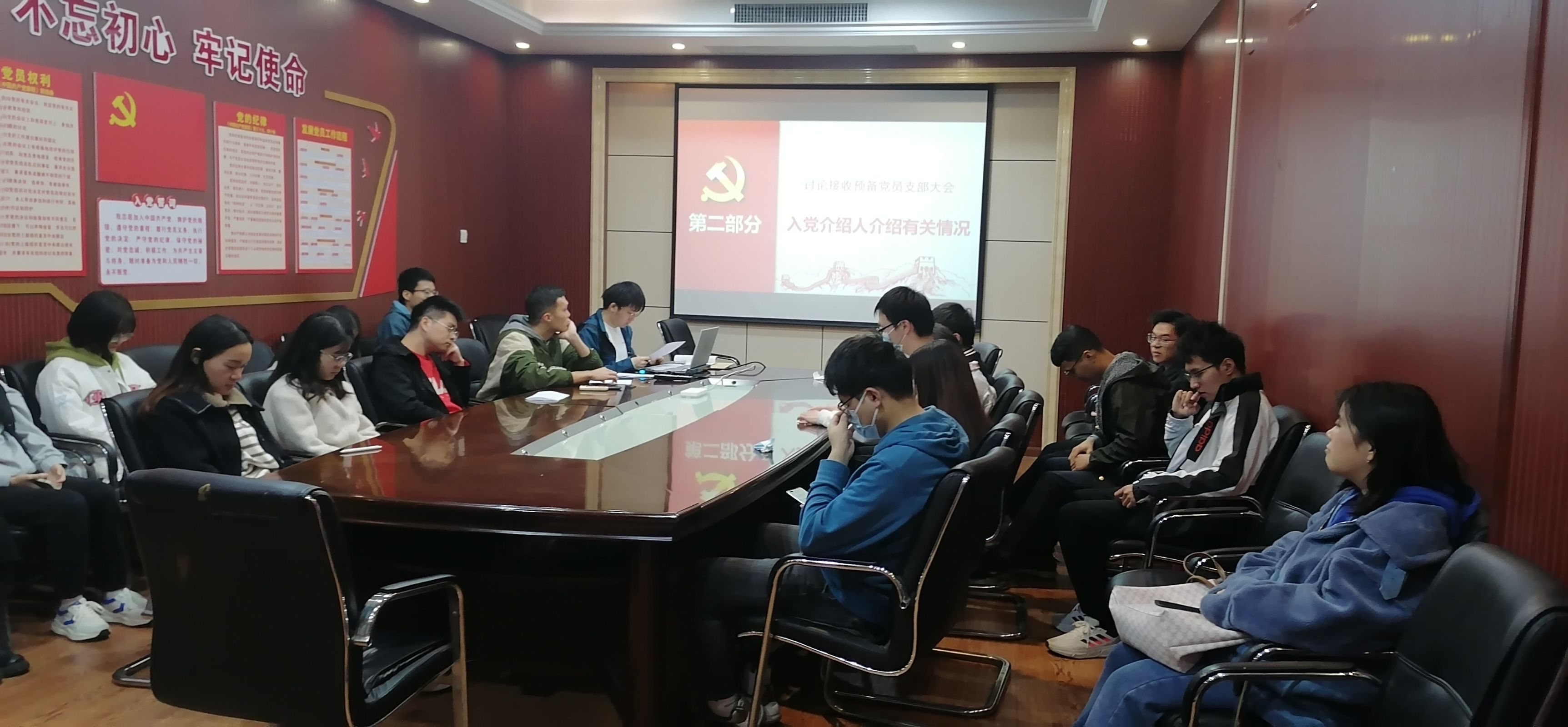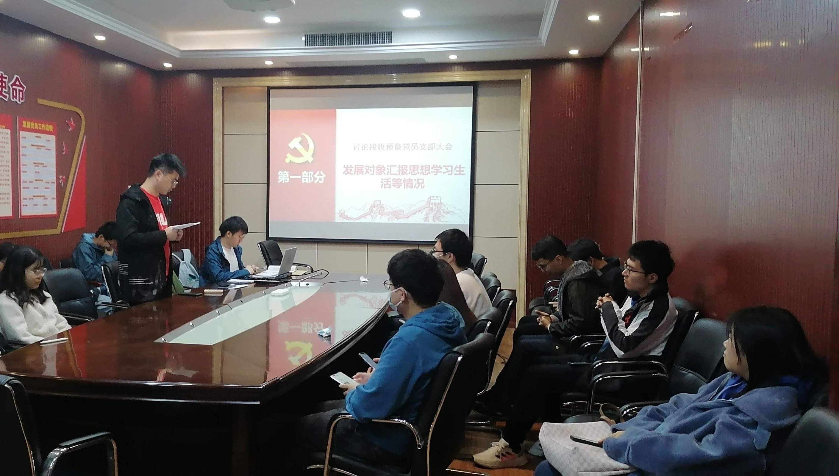 会议开始,由支部书记邹仁伟同志对本次会议的基本内容进行了介绍,主要为讨论朱俊杰同志与赵炜同志的预备党员接收。首先,朱俊杰同志与赵炜同志向组织汇报了自己在预备期间的工作学习情况,阐述了个人思想认识等方面的进步,表达了自身的发展意愿。