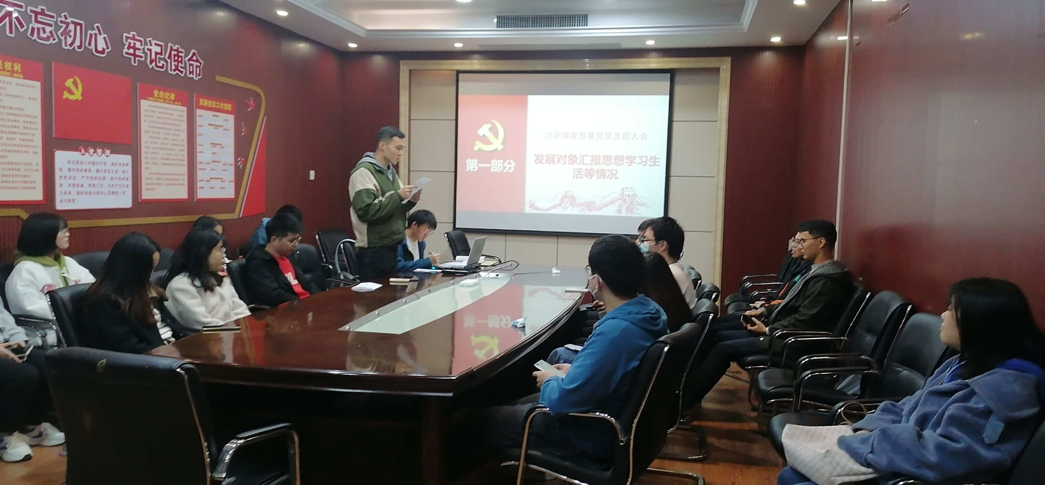 504会议室召开接收预备党员支部大会。本次会议由支部书记邹仁伟同志主持,主要内容包括对朱俊杰同志与赵炜同志的预备党员接收讨论。本次会议应到正式党员及预备党员28人,实到参会党员20人,发展对象与入党积极分子也参与了会议。