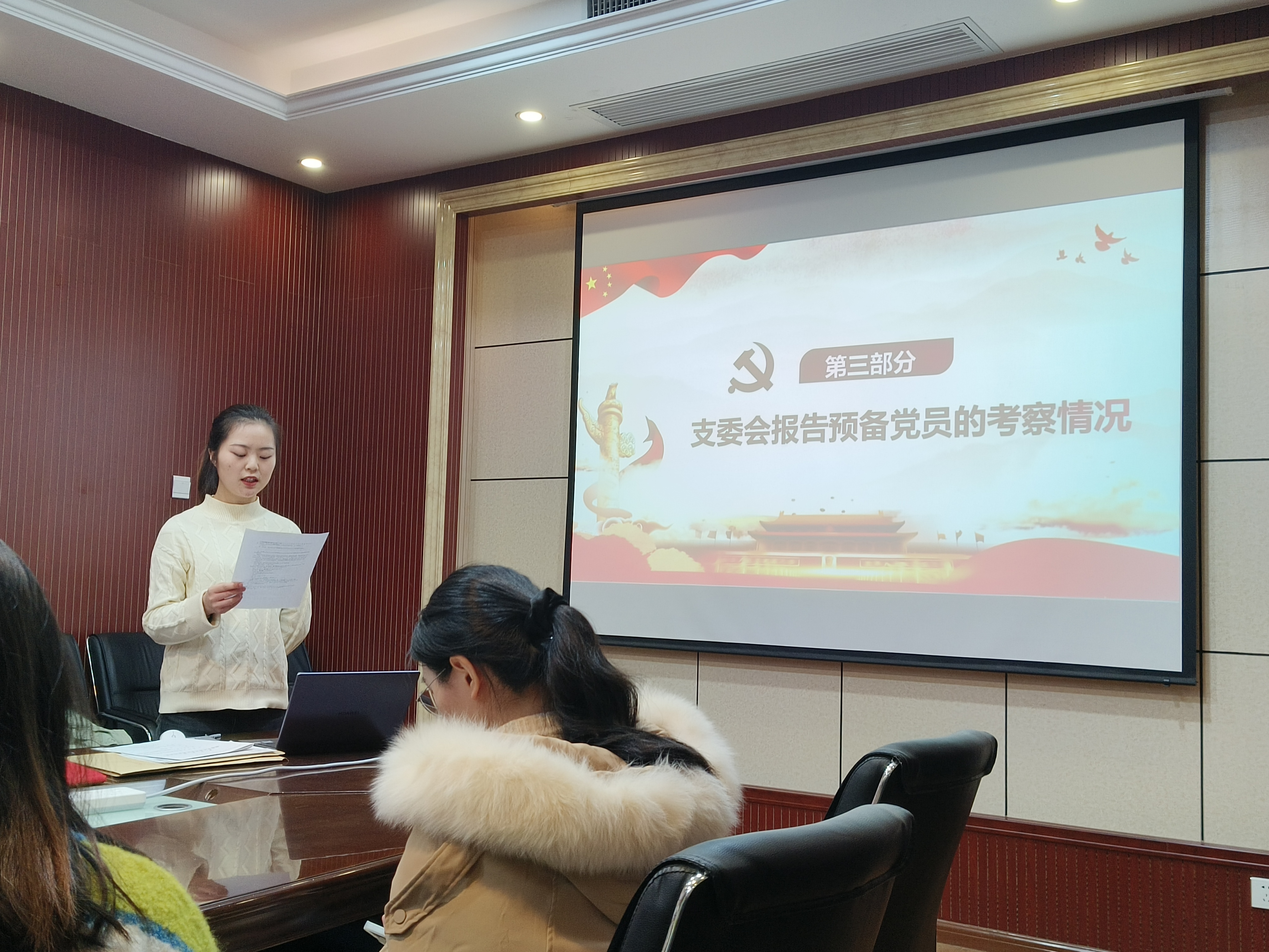 会议第三项:党支部书记王钰莹同志代表支部委员会报告了贾芷溢、曹敏雪同志在预备期间的教育考察情况。对两位同志的教育经历、家庭背景、学习情况等进行了介绍,对其在生活学习中的优点进行了肯定,对其不足之处发表了意见。