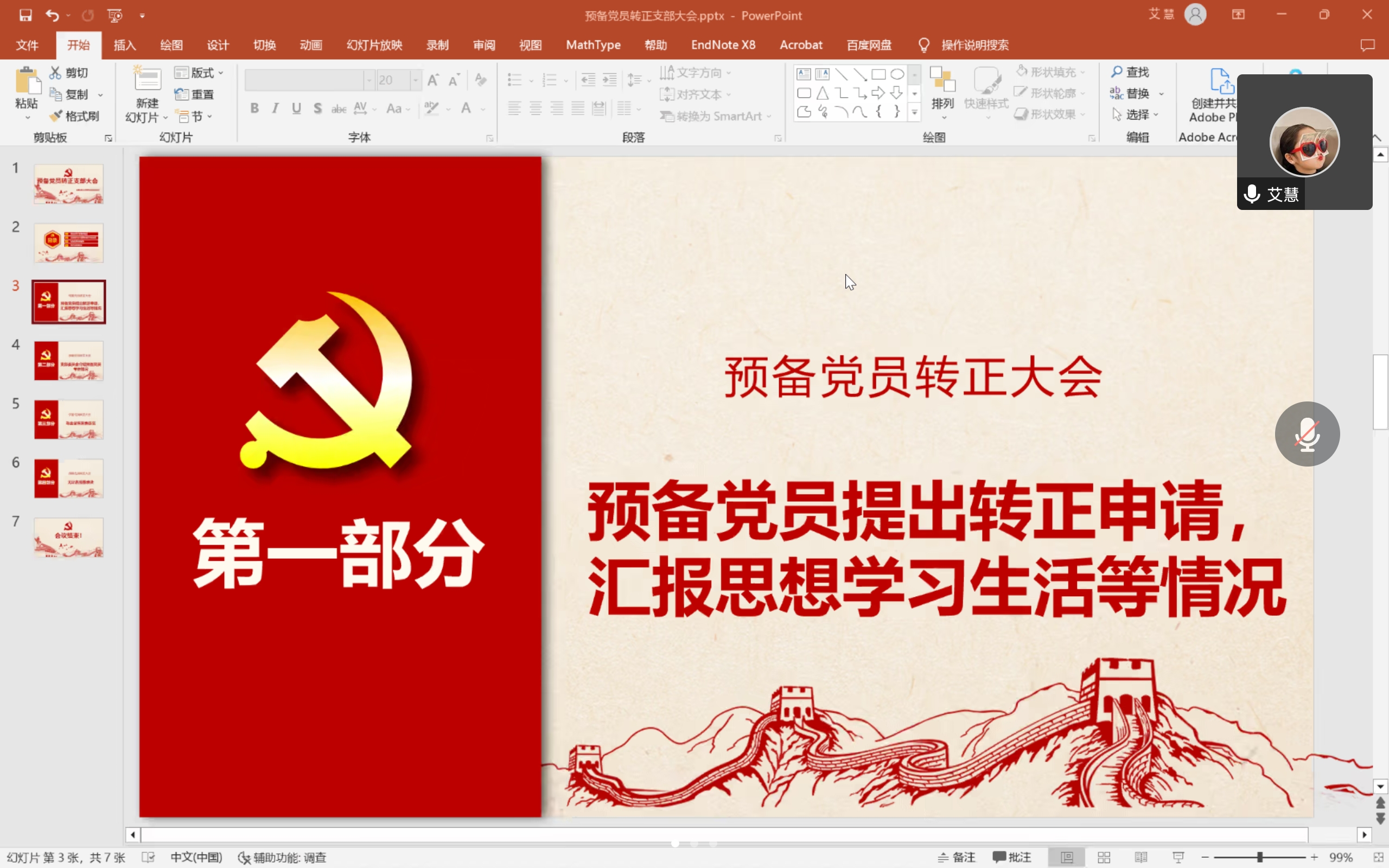 2022年12月30日下午2点3分,环境科学与工程系研究生第四党支部召开预备党员转正大会。由于疫情影响,本次会议于线上召开,由艾慧同志主持,主要内容为讨论预备党员杨帆同志的转正问题。本次会议应到正式党员21人,预备党员7人,实到正式党员13人,预备党员7人,请假8人,有表决权的到会人数超过应到会有表决权人数的半数,符合规定人数,可以开会。
