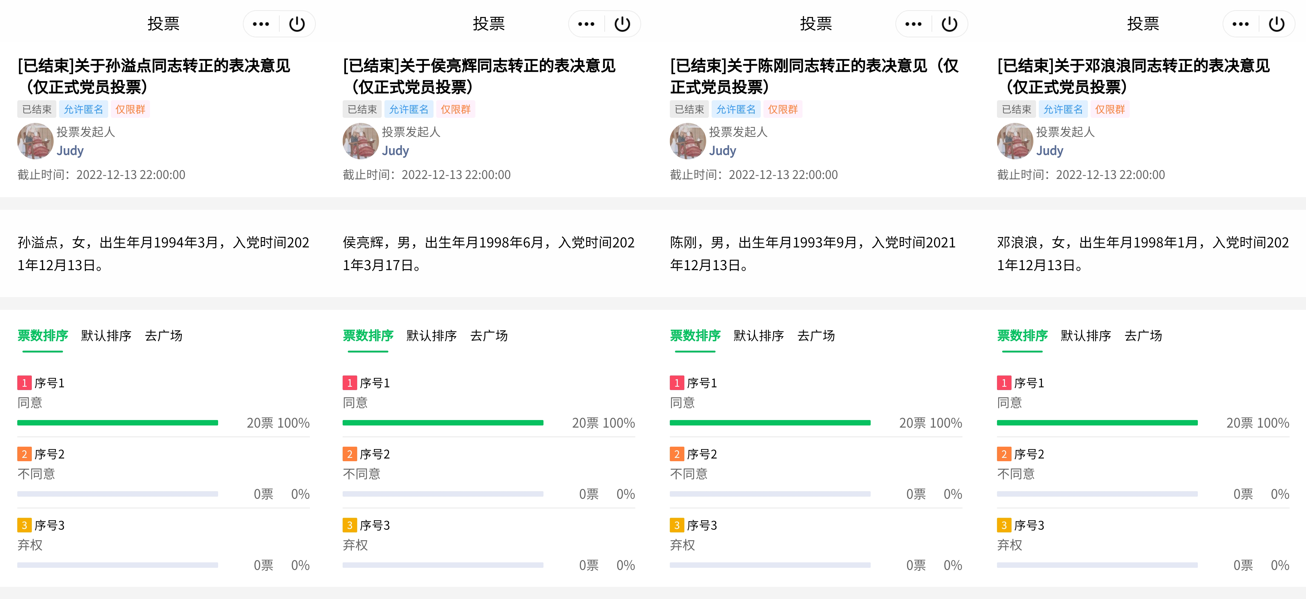 会议第二项,讨论预备党员侯亮辉同志的转正问题。首先由侯亮辉同志汇报了其预备期间的思想、工作情况,其第一考察人廖克俊和第二考察人佘思佳对其预备期的表现进行评价,党支部书记何凡同志代表支部委员会报告该同志在预备期间的教育考察情况,与会党员对侯亮辉同志在预备期间的各方面情况表示肯定。经过无记名投票,表决结果为:侯亮辉同志得赞成票20张,不赞成票0张,弃权票0张,对侯亮辉同志的赞成人数超过应到会有表决权的正式党员的半数,同意其按期转为中共正式党员。