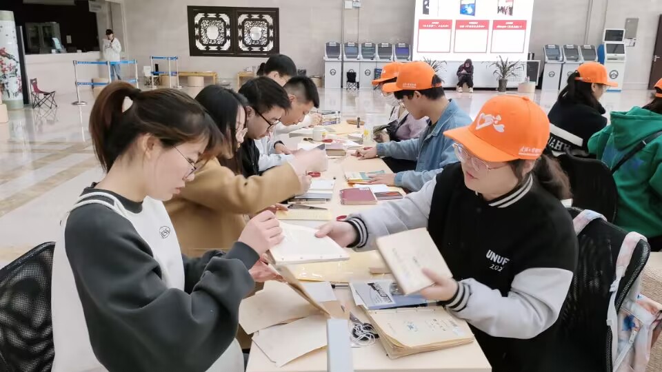 在修书志愿队的同学演示完毕后,支部成员便正式开始修复自己手中的第一本书。从截取装订线,到裁剪接补纸,到最后粘合脱落的书皮,支部成员们聚精会神,热火朝天地工作着。经过一上午支部成员们联合修书志愿队同学们的修补,40余本破损的书籍换上了新装,焕发了新的生机与活力。一本本图书仿佛艺术品一般摞列在一起,散发着思想的魅力。修书如修心,在修复古籍的过程中,我们每个人的心都静了下来,暂时忘却了生活中的烦恼与琐事,全神贯注于艺术品的创作之中。