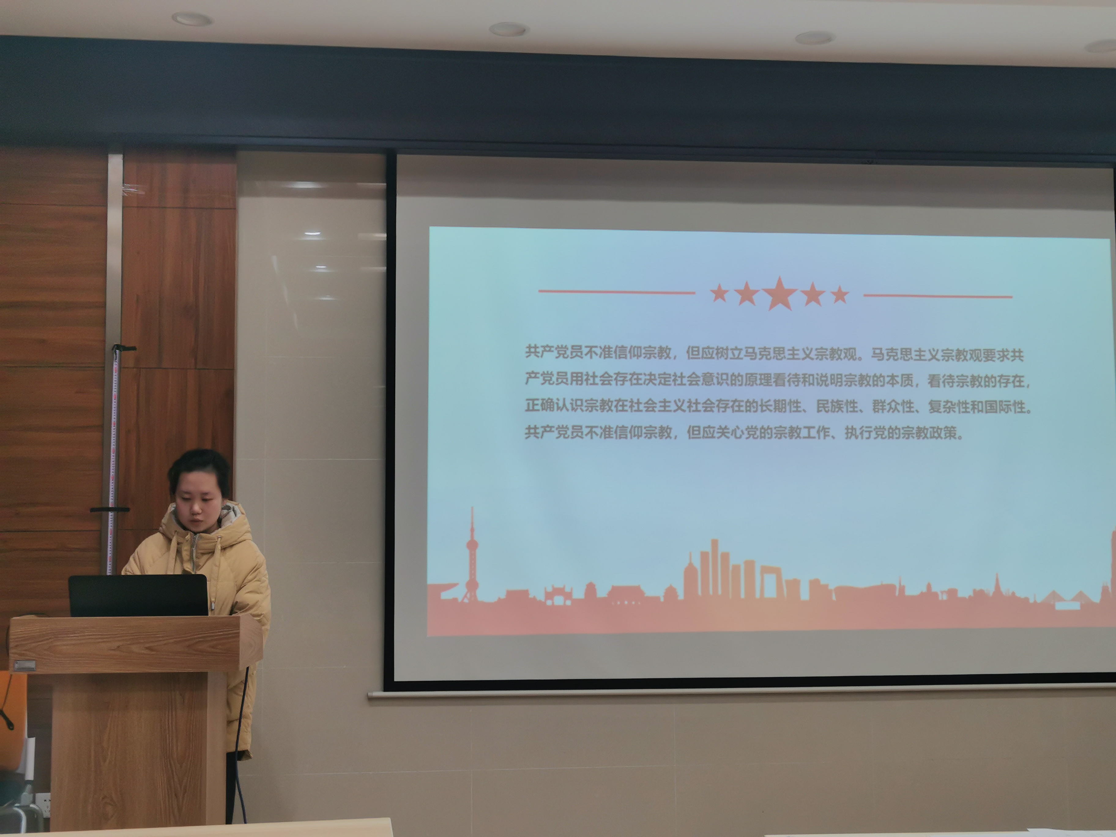 会议第三项,转正党员讲党课。分别由周睿雅、杜静维同志带领大家进行了“习近平在十四届全国人大一次会议上发表重要讲话”与“党员不得信仰宗教”主题教育。周睿雅同志指出,习近平总书记的重要讲话,彰显着对国家的强烈使命担当、对人民的深厚情感,充满着对推进强国建设、民族复兴的坚定信心信念,对我们来说是科学指引、是有力动员,也是激励鞭策。杜静维同志指出,作为共产党员不能信仰宗教,这是由党的理想信念决定的。我们要完整准确全面领会和贯彻新时代党的宗教工作理论和方针政策,深刻理解核心要义、精神实质、丰富内涵和实践要求,做到学思用贯通、知信行统一。