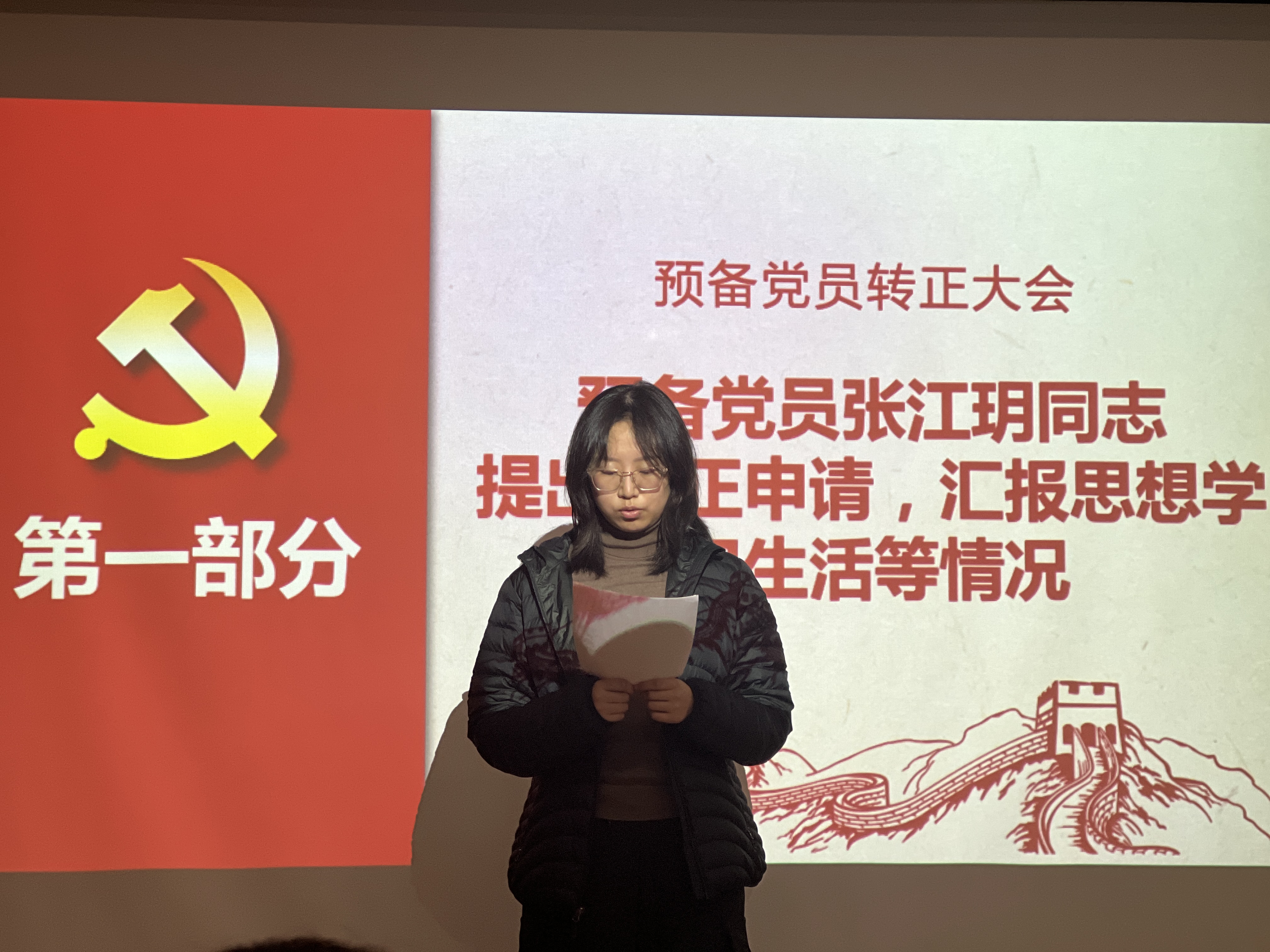 会议第一项,讨论张江玥同志的转正工作。首先由张江玥同志汇报预备期间的思想和工作情况;之后由支部委员会报告张江玥同志预备期间的教育考察情况。经过有表决权的正式党员进行无记名投票,本次大会表决结果为:张江玥同志得赞成票23张,不赞成票0张,弃权票0张,同意其按期转正为中共正式党员。最后,张江玥同志进行表态,向党组织表明了自己的决心和信心。