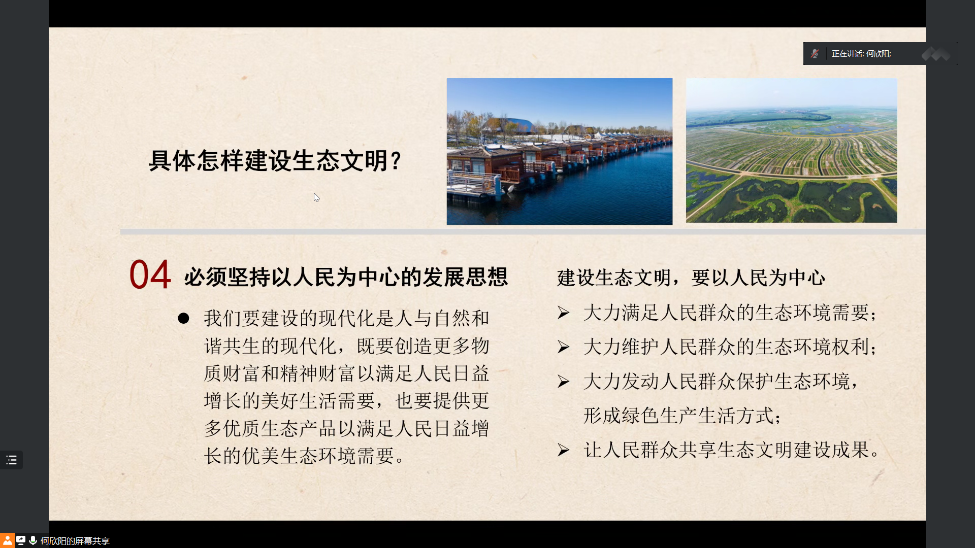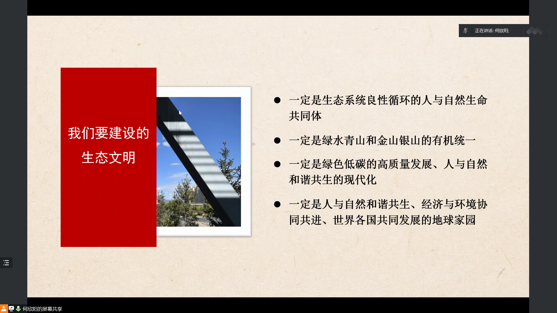 会议第一项,学习解读“深入学习贯彻习近平生态文明思想——促进建设万物和谐的美丽家园”。何欣阳同志介绍了习近平总书记提出的生态文明建设六大原则,从为什么要建设生态文明,建设什么样的生态文明和具体怎样建设生态文明三个方面出发,系统回顾了习近平生态文明思想。随后,何欣阳同志和与会党员分享了建设万物和谐美丽家园的“中国故事”,呼吁大家担负起生态文明建设的政治责任。