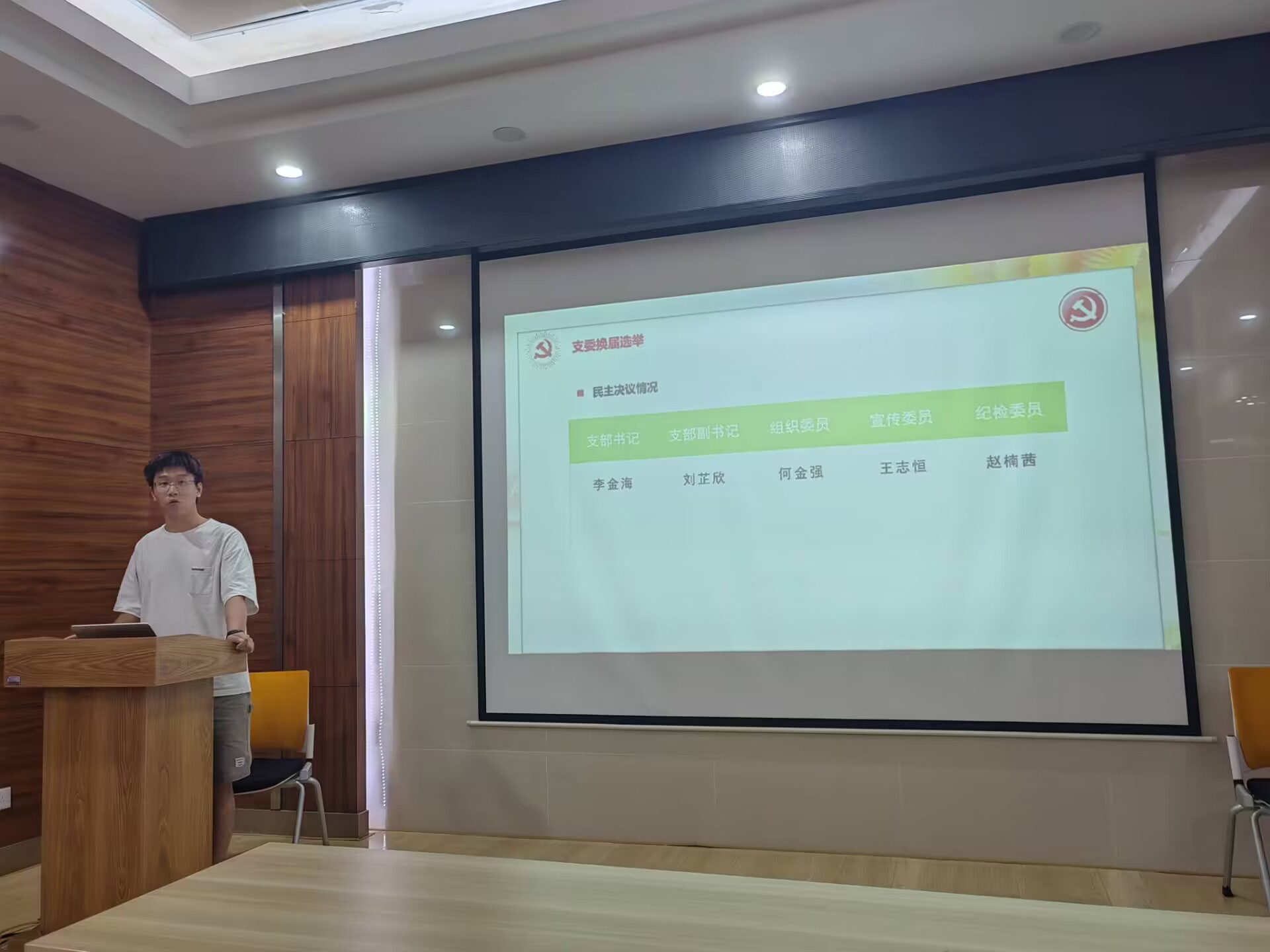 会议第二项,支部委员换届。李金海、刘芷欣、何金强、王志恒、赵楠茜五位支委候选人分别介绍了个人情况、能力优势并阐述了未来的工作规划。由正式党员进行无记名投票并现场公布投票结果,经表决,五位同志得到了党支部成员的一致认可。依据投票结果,由李金海同志担任新任党支部书记、刘芷欣同志担任新任党支部副书记、何金强同志担任党支部组织委员、王志恒同志担任党支部宣传委员、赵楠茜同志担任党支部纪检委员。