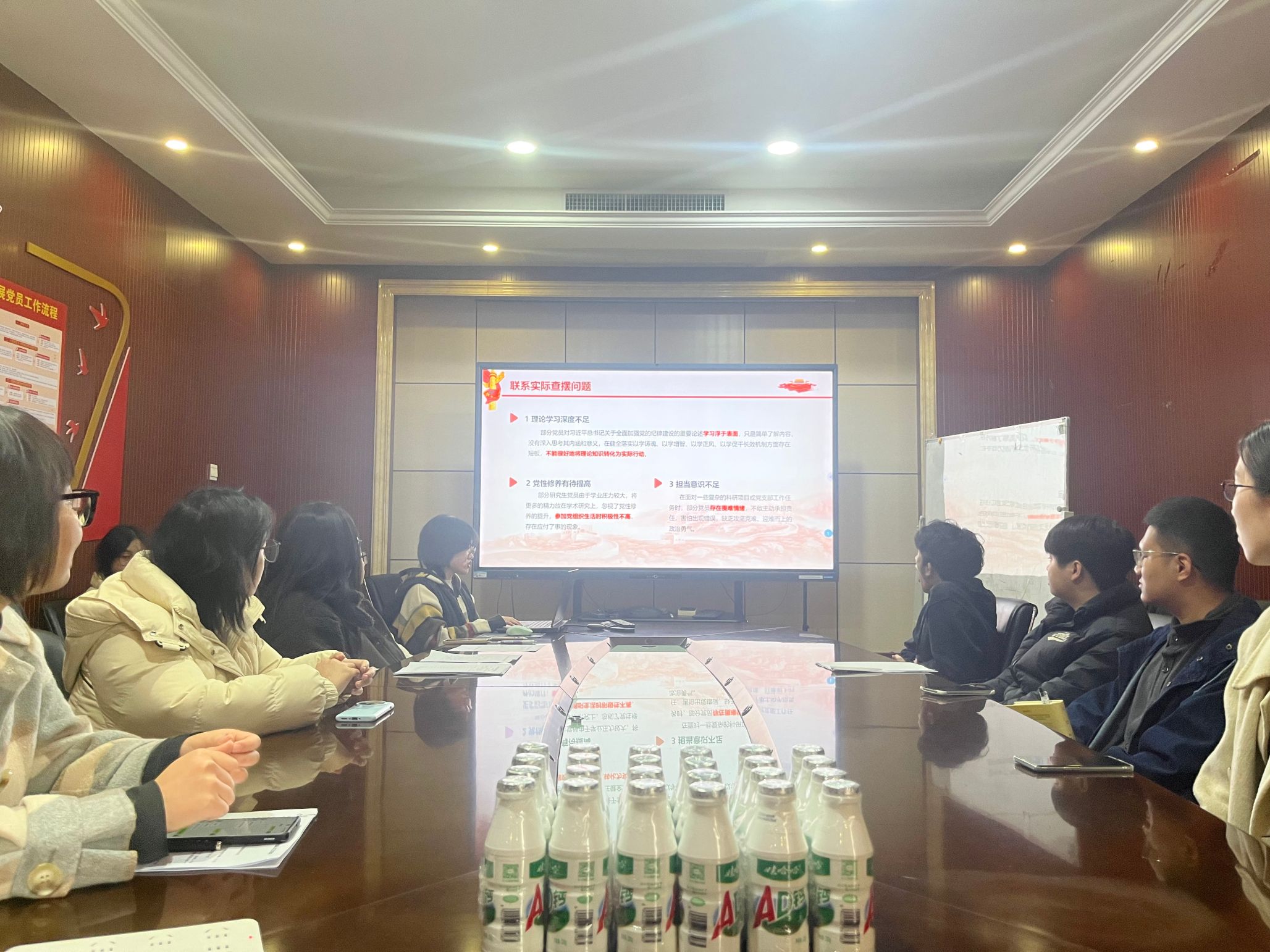 会议第二项,联系实际查摆问题。支部书记王丹总结了过去一年党支部活动开展情况及新成员发展情况,并指出了支部存在的问题:第一,理论学习深度不足,部分党员对习近平总书记关于全面加强党的纪律建设的重要论述学习浮于表面;第二,党性修养有待提高,部分研究生党员参加党组织生活时积极性不高,存在应付了事的现象;第三,担当意识不足,在面对一些复杂的科研项目或党支部工作任务时,部分党员存在畏难情绪。支部书记王丹针对支部存在的各项问题提出了解决方案,进行了下一阶段的工作部署。