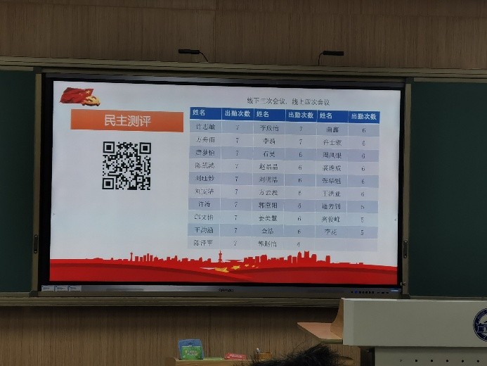 会议第三项,民主评议。首先,由纪律委员方舟雨同志宣读民主测评具体流程与规则,对党员进行民主测评。参评的正式党员为39人,其中评定为“优秀”的比例一般不超过党员总数的1/3,即不超过13名。预备党员参与民主评议,但不评定等次,由与会成员对全体参评党员进行无记名民主评议,线下未能到场的成员通过线上问卷形式参评。最终获评优秀的12位成员如下:唐梦怡,方舟雨,许思敏,许涛,陈凯鸿,刘雯洁,石昊,曲鑫,邱文韬,刘祥林,刘珏妙,王韵涵,其余评定等级为合格。