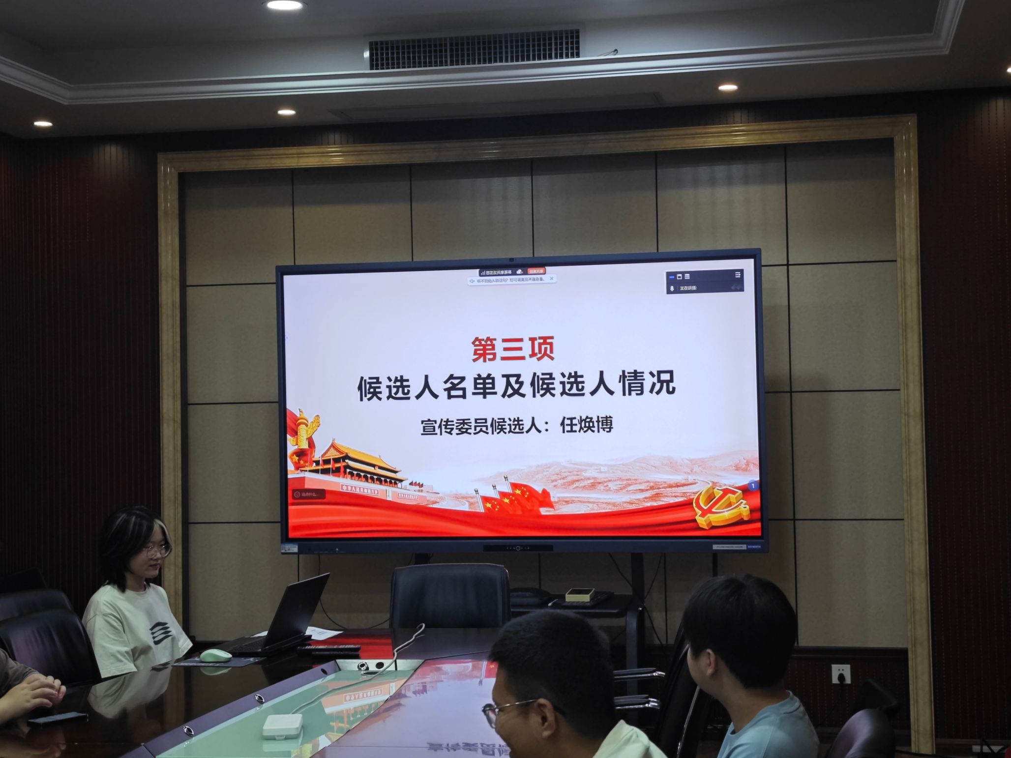 会议第三项,支委调整。王丹同志代表党支部委员会向支部党员大会报告工作。经个人申报与组织审核,王丹同志宣读了候选人名单,任博、周贝贝、任焕博和杨冉茂同志分别进行了竞选发言,由正式党员进行无记名投票并现场公布投票结果。经表决,四位同志均得到了党支部成员的一致认可,任博同志当选为党支部书记,周贝贝同志当选为组织委员,任焕博同志当选为宣传委员,杨冉茂同志当选为纪律委员。