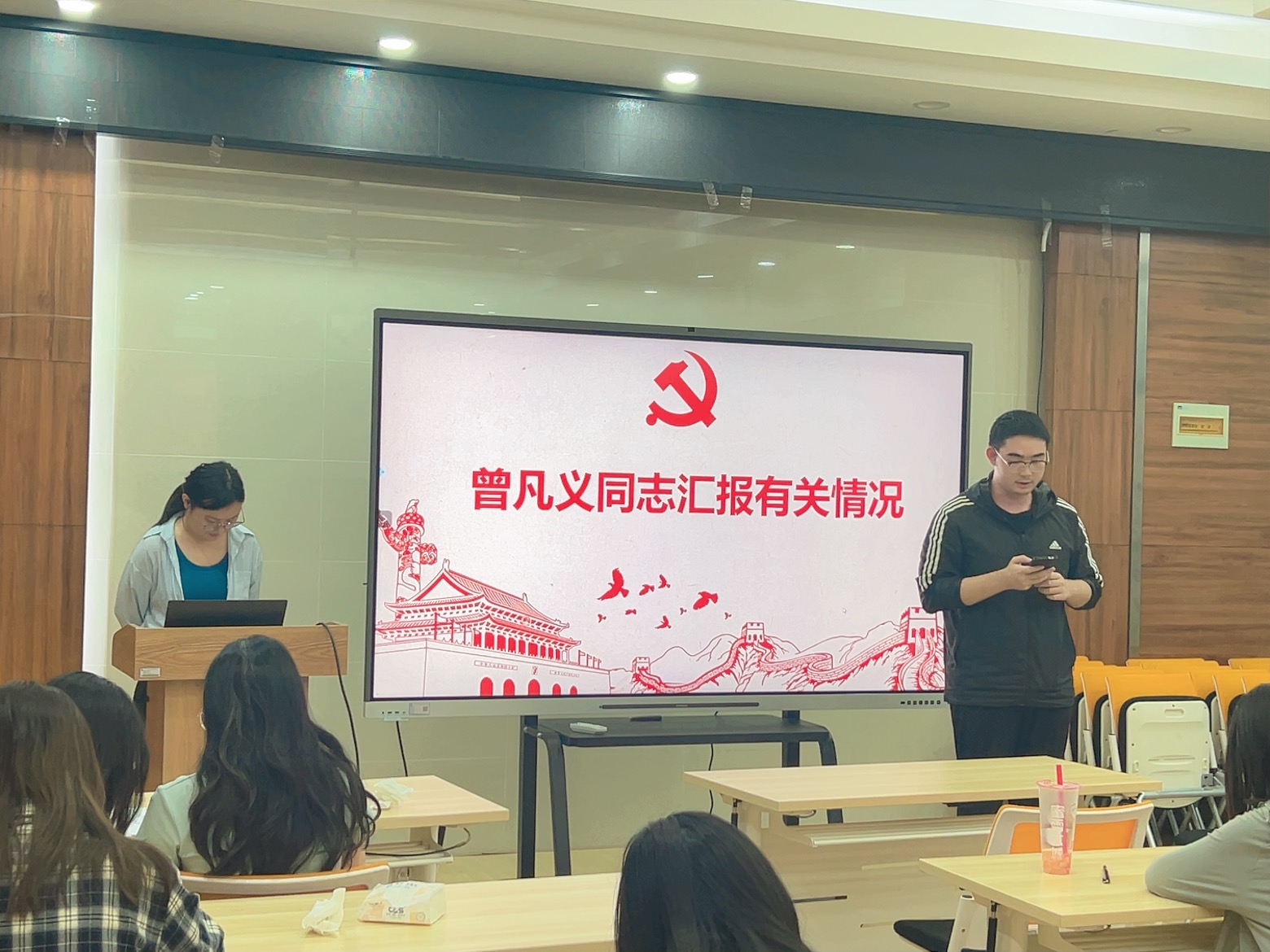 曾凡义同志汇报了自己在积极分子与发展对象期间思想、生活与学习方面的收获与进步,阐明了自己进一步发展的意愿。曾凡义同志的入党介绍人江乐怡同志和张心宇同志介绍了其在积极分子考察阶段的表现,同意接收其为预备党员;之后,牛羽庆同志代表支部委员会报告审查情况,与会党员成婷同志、陈舒颖同志和李艺帆同志发表意见,对发展对象是否符合党员条件进行充分讨论,并依次对发展对象能否入党进行无记名投票表决。最终收回的19张表决票均同意接收曾凡义同志成为预备党员,赞成票超过参与表决人数的一半,本次表决有效。