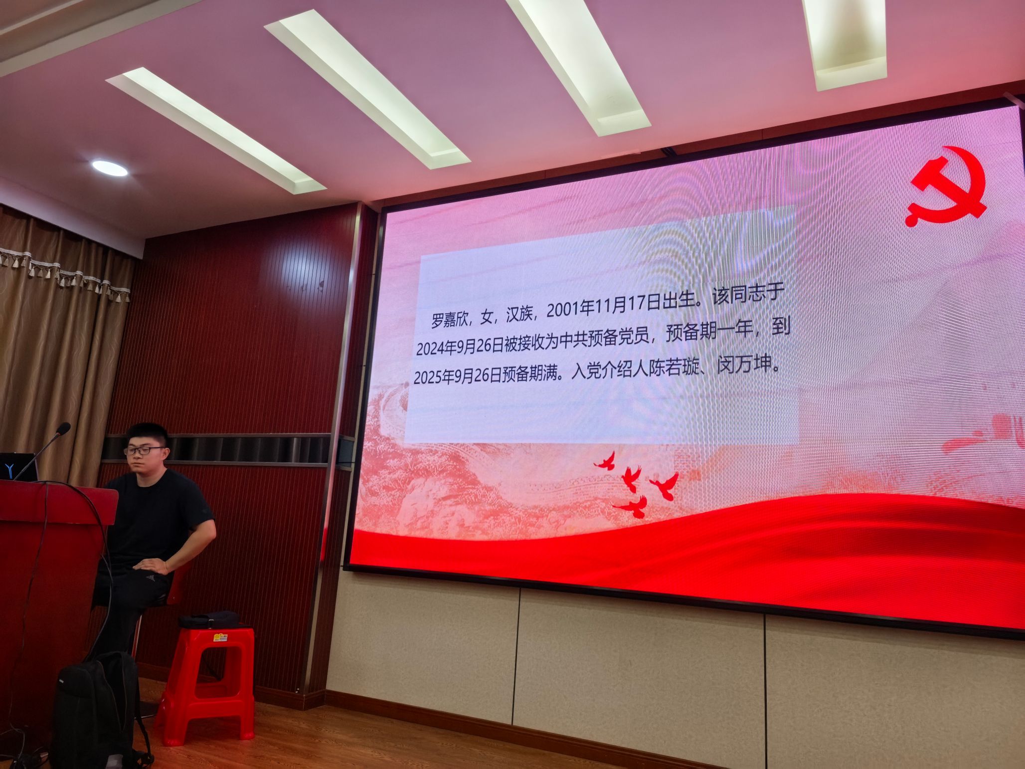 会议第二项,讨论预备党员胡瀚历、褚天佑、罗嘉欣同志的转正申请。三位同志分别向党支部汇报在预备期内的思想情况,介绍了科研学习和生活上的表现并进行总结与反思。接下来,由三位同志的培养考察人汇报考察情况,在政治思想和学习生活中均积极向党组织靠拢,符合正式党员标准。随后,与会党员发表意见,对三位同志的表现给予肯定。