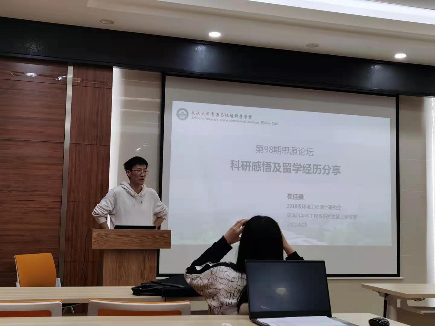 会议第一项,崔佳鑫同志在此次活动中以“溶解性硅对零价铁/氧气体系去除抗生素类污染物的影响”为例分享了自己在环境化学实验过程中的科学研究方法实践,为大家总结了科研中有益的方法和心得;并且以自己的留学经历,为大家讲解了留学申请的详细程序和注意事项,针对大家提出的相关问题进行了详细解答。