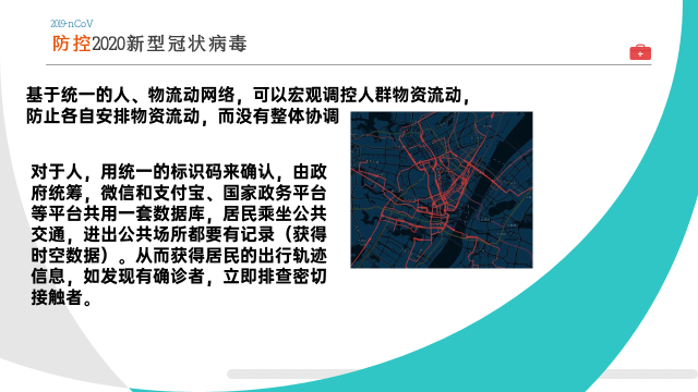 随着疫情逐渐放缓,除湖北之外的省市已经着手要开始复工复产,恢复社会秩序,为防止出现二次爆发,可建立一个统一的反应人群、物资流动的可视化平台,便于管理部门决策。对于人,用统一的标识码记录其乘坐公共交通,进出公共场所的出行轨迹信息,如发现有确诊者,立即排查密切接触者。对于防疫物资和生活物资可视化其运输路径。