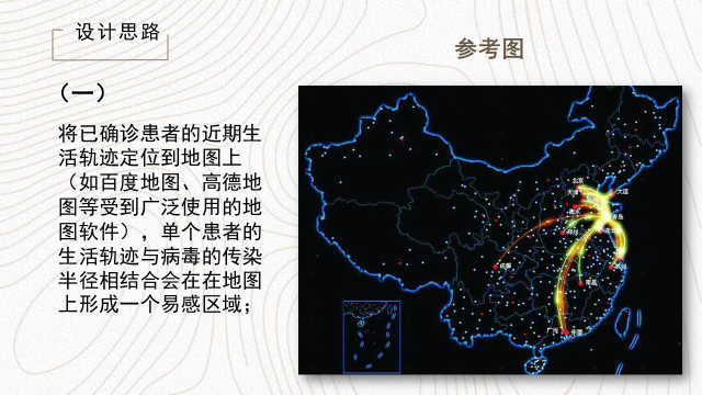 新冠肺炎传播途径主要为直接传播、气溶胶传播和接触传播。因此,对已确诊人员的活动轨迹监测对疫情管控工作来说具有重大意义。基于地理信息技术、卫星定位技术等建立疫情地图,将疫情信息与地图软件结合,在空间上实现可视化,可以让受众更直观地了解自己周边区域的疫情信息以及空间分布;让政府更了解疫情的空间分布情况,可为政府的疫情防护工作提供辅助信息。