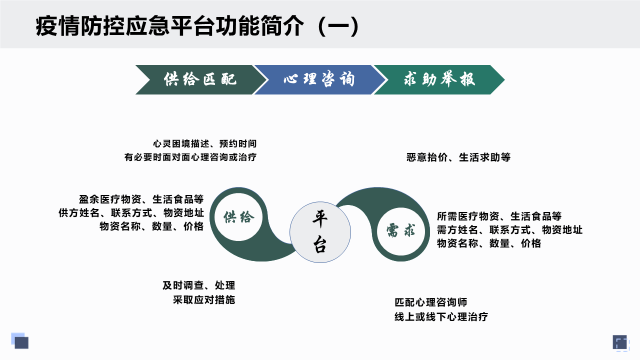 为解决食物供需时空紊乱造成不必要的损耗、居家隔离造成的心灵微创、地域性医疗人员、物资设施配套紧张、封闭造成的交通环境变化等现实困境,设计疫情防控应急平台,以提供供需匹配、心理咨询、信息导航、健康自检、交通推荐、求助举报等功能。
