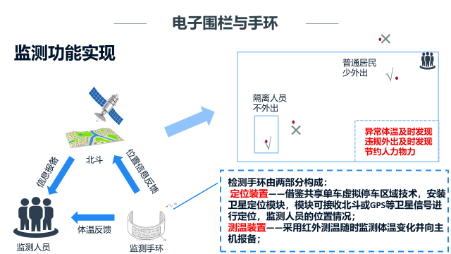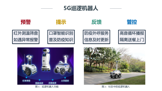 为解决社区居民体温检测、隔离监管、社区防控等实际需求提出的智慧社区-疫情联防联控平台。包括三大功能模块:热成像测温、电子围栏与手环和5G巡逻机器人。利用热成像测温功能检测社区内每名住户的体温,一旦检测出异常体温状况,立即联网上报,无需人工筛查浪费时间,并提醒社区内其他住户注意安全。电子围栏与手环配合,可以实时掌握隔离居民的位置及体温状况。为帮助社区防疫、避免交叉感染,智能机器人能够利用红外测温、气体监测、远程指挥、口语对话等功能替代社区人力,有效辅助科创社区完成社区调研、社区防控等工作,缓解人力紧张情况,提升隔离管控水平。