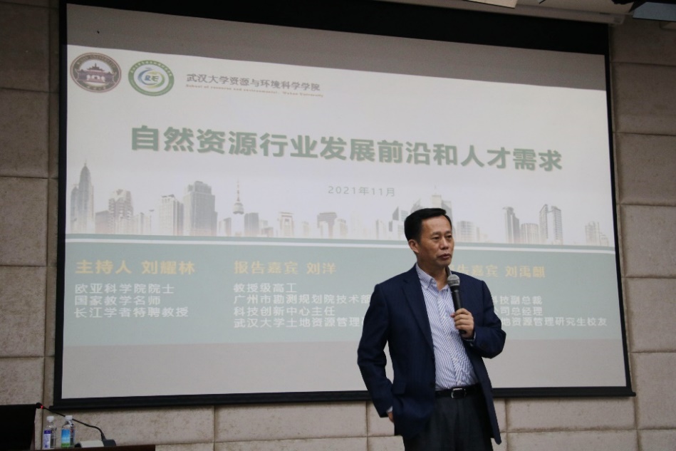 刘耀林教授主持,特别邀请广州市城市规划勘测设计研究院技术部部长教授级高级工程师刘洋、广东国地规划科技股份有限公司副总裁刘禹麒两位优秀校友,结合个人成长经历及自然资源行业发展的前景和人才需求,为2021级本科生做了精彩的报告。