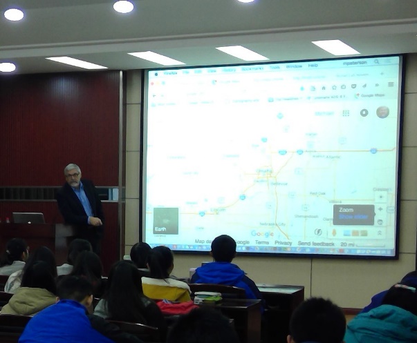 邀请,向2014级地理信息科学专业87名本科学生进行了为期三周的授课。课程名称为“云端制图”,内容选自Peterson教授2014年新编写的《Mapping in the Cloud》的主要章节。Peterson教授备课充分,授课认真,对学生热情负责,圆满完成了授课任务,给老王论坛