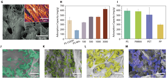图2.(G)吸附PS微球后材料的扫描电镜图像。(H)材料对PS-NH2、PS-COOH 和不同直径(100、500、1000 和 3000 nm)PS微塑料的吸附能力。(I) 材料对 PS、PP、PET和PMMA颗粒的吸附能力。材料吸附(J)PS、(K)PMMA、(L)PET和(M)PP颗粒后的扫描电镜彩色图像,其中彩色区域代表微塑料。