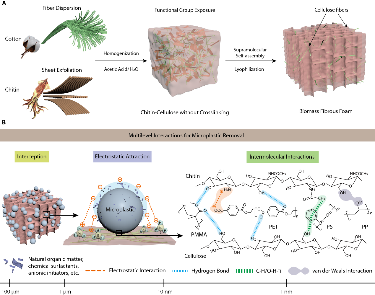 图1. (A)利用纤维素和甲壳素自组装构建超分子生物质纤维海绵的示意图。(B)由于材料丰富的活性官能团,生物质纤维海绵可以通过多层次的相互作用(物理拦截、静电吸引和多种分子间相互作用)来去除微塑料。