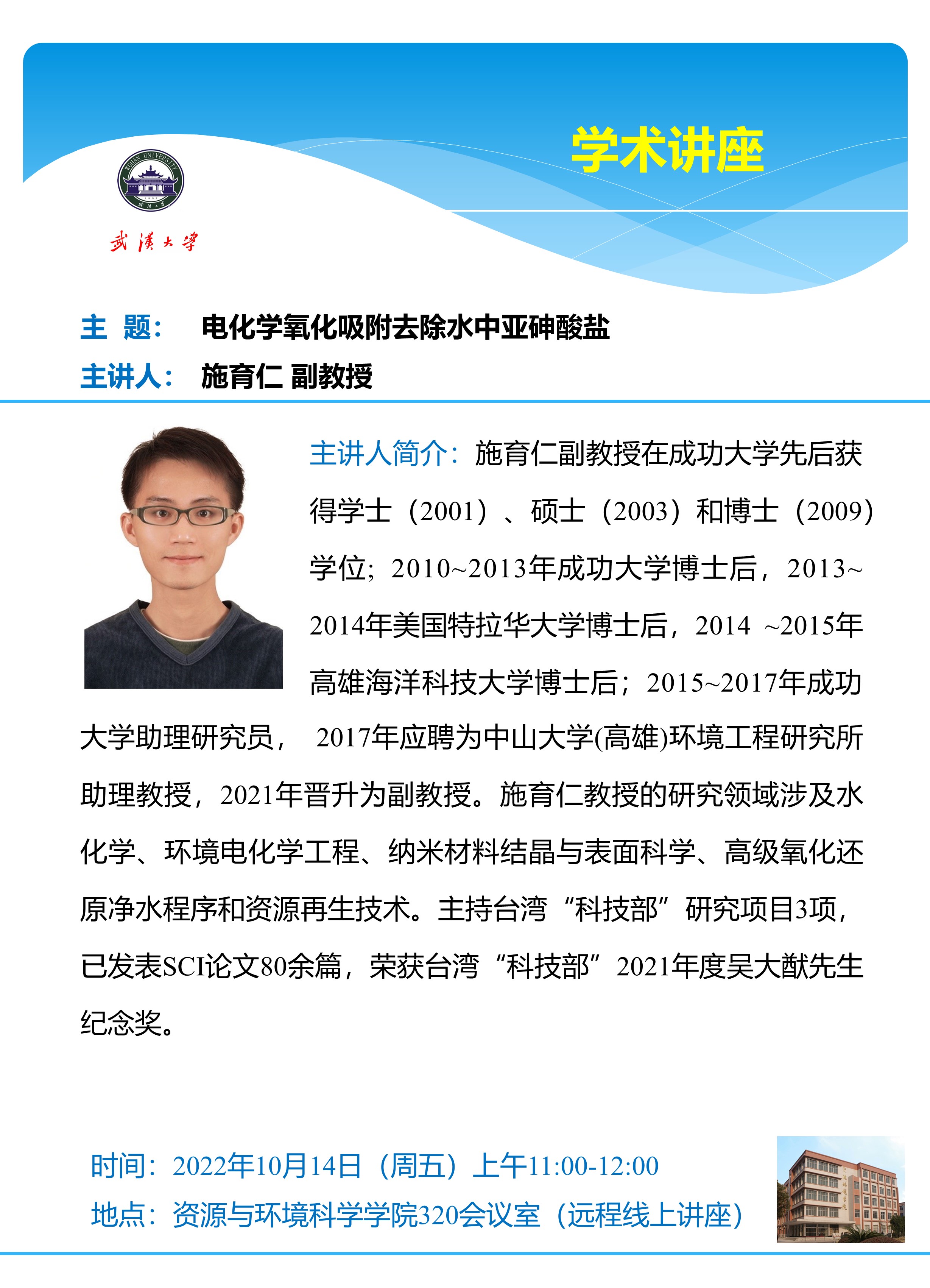 【学术讲座】电化学氧化吸附去除水中亚砷酸盐