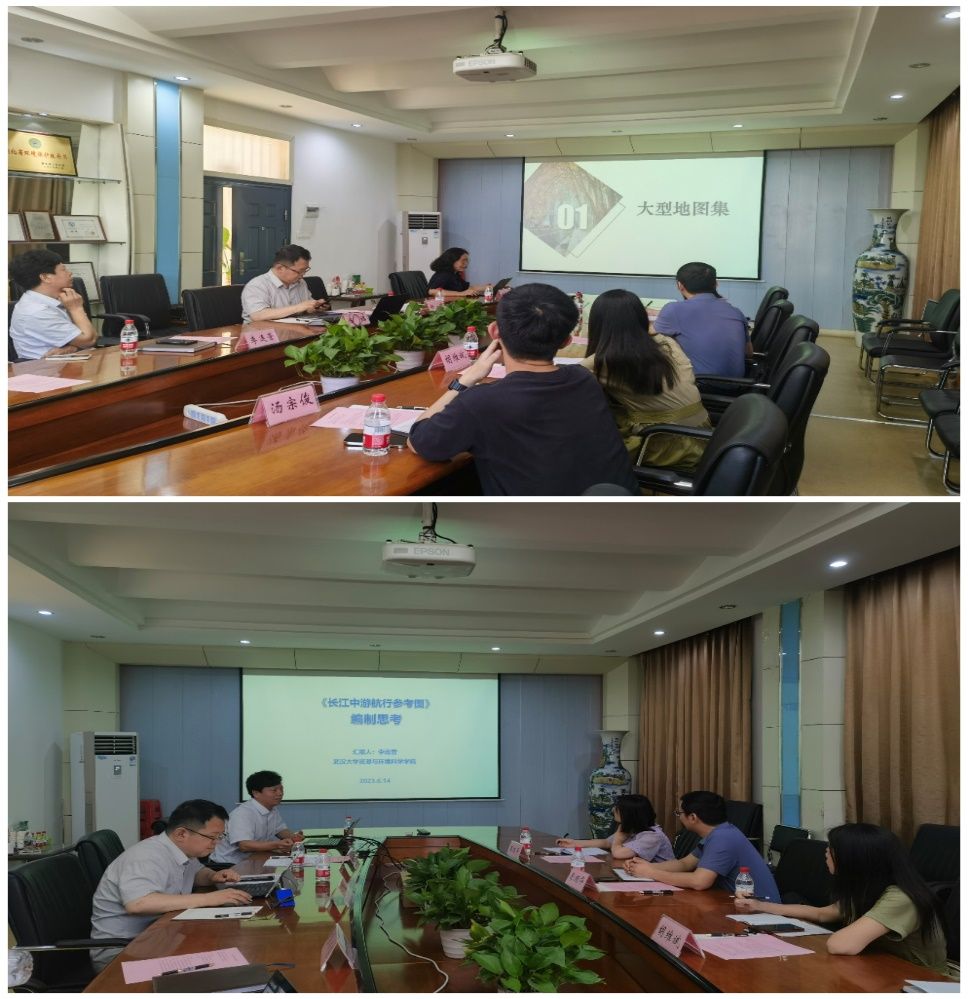 在交流环节,翁敏副教授介绍了学院近期在地图制图方面科研情况,着重介绍了“叙事地图”、“场景地图”等方面的尝试和实践。翁敏副教授团队近年主持的“西安城市旅游地图”、“五彩嘉兴地图”、“珞珈赏樱地图”等获得良好社会反响。李连营教授作了《长江中游航行参考图编制思考》的报告,详细介绍了项目组在内河航道制图方面作出的探索和创新。《长江中游航行参考图》编制采用一览性、普适性、现势性、规范性等设计思路,实现地图与文字并茂、人文与自然并重,遵循主次有序、布势均衡、整体紧凑的内容编排,聚焦用户使用需求,优化比例尺、地图负载量、制图区域等影响因素,使用规范的地图符号库来表示航道要素,同时创新使用遥感影像羽化做背景的方法,体现水路一体、江海联通的设计理念。
